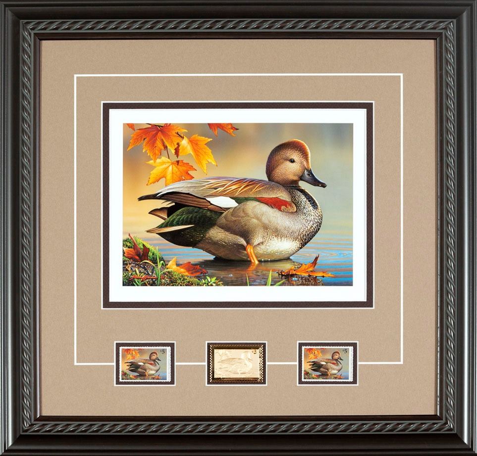 The 39th DU Stamp Print image features a drake gadwall by artist Adam Grimm. It includes the matched DU stamp print, stamp medallion, mint stamp and artist signed stamp. Overall size is 18 ¼”x 18 ¼”.