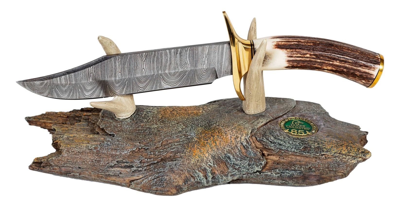 This year’s Knife of the Year is a 11 5/8” knife with a Damascus steel fixed blade and stag handle. The knife features a brass finger guard and a Ducks Unlimited crest medallion on the pommel. The faux driftwood base includes an 85th Anniversary cloisonne medallion inlaid on the top.