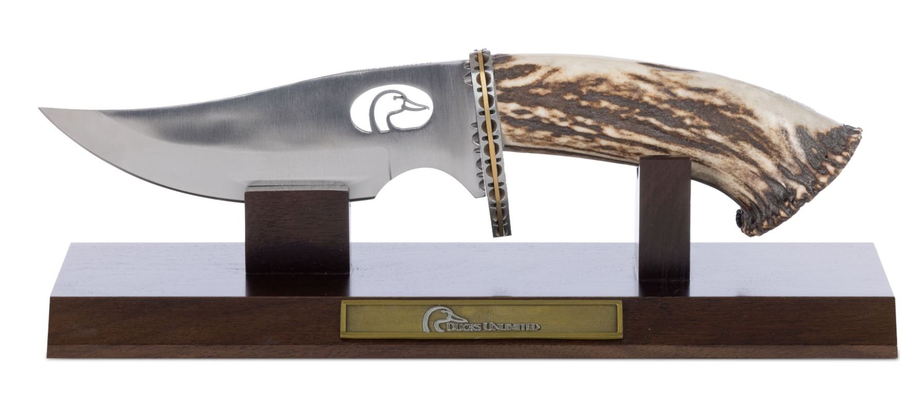 Presenting the distinguished 2024 Knife of the Year, a striking fusion of aesthetics and functionality that seamlessly bridges the worlds of display and field use. This knife exudes elegance with its antler crown handle, while its 420 stainless blade showcases a meticulously crafted cutout of the iconic duck head logo. The finger guard is adorned with intricate file work, adding to its exquisite design. Accompanied by a stand made from premium black walnut, proudly bearing a metal plate embellished with the Ducks Unlimited logo, the presentation becomes a conversation-worthy piece. A leather sheath adds practicality to this artful ensemble. With a length of 12 inches, this knife is not only a work of art but a testament to durability and craftsmanship, perfect for both collectors and outdoor enthusiasts.