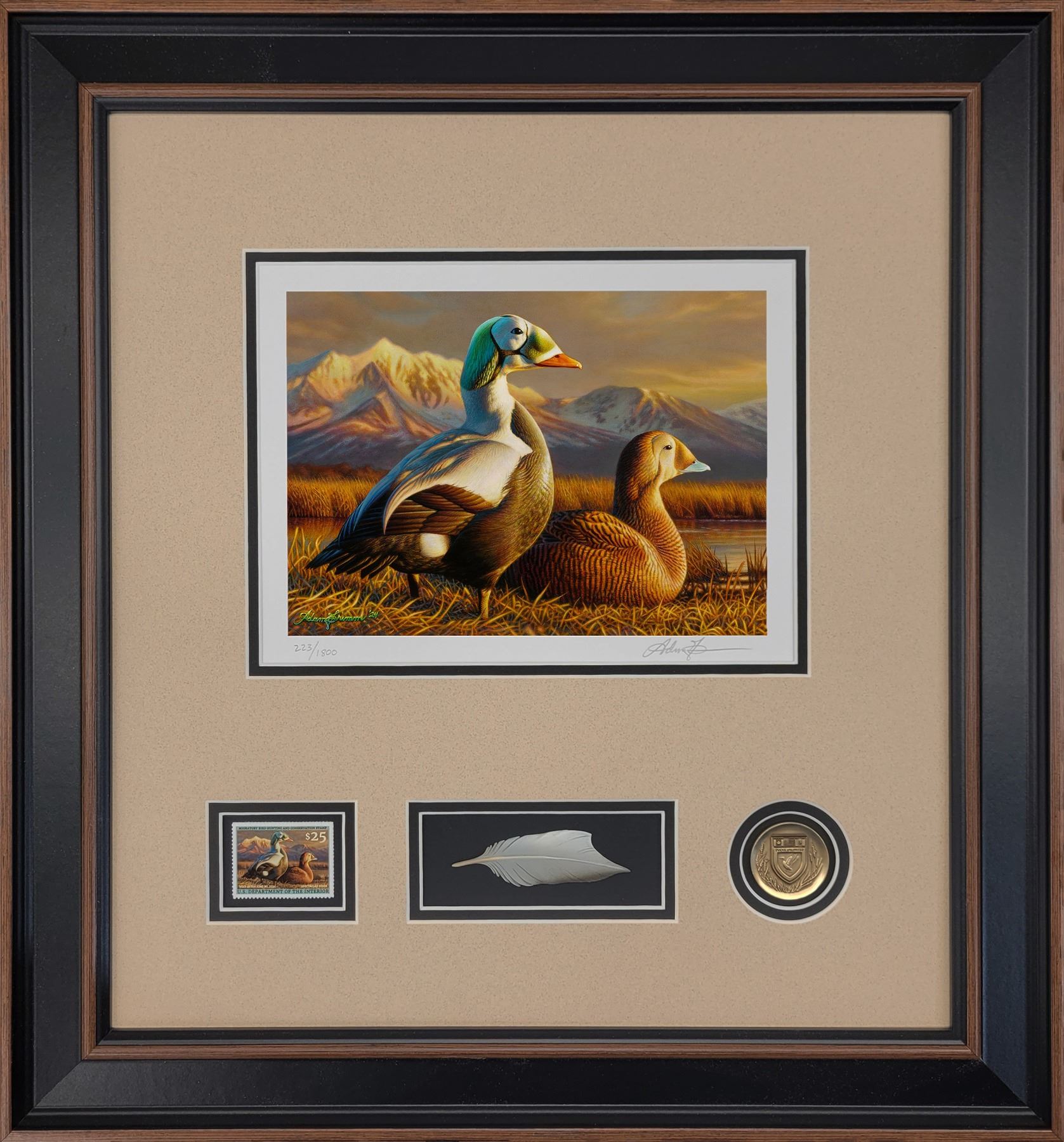 The 2025 Federal Duck Stamp Print features the acclaimed artwork of Adam Grimm, one of the nation’s leading wildlife artists. This print showcases the 2025/2026 Federal Duck Stamp, which depicts a pair of Spectacled Eiders against a mountain backdrop. This is Grimm’s 3rd win in the Federal Duck Stamp Contest. Presented in a framed format, it includes double matting for enhanced visual appeal and durability. Exclusive to Ducks Unlimited events, the print is adorned with a DU crest medallion and a carved feather, adding a touch of distinction and highlighting its special association with DU conservation efforts. The 2025 Federal Duck Stamp Print by Adam Grimm not only celebrates the beauty of waterfowl but also supports conservation initiatives critical to preserving their habitats. Framed dimensions are 19.5” x 21.25”.