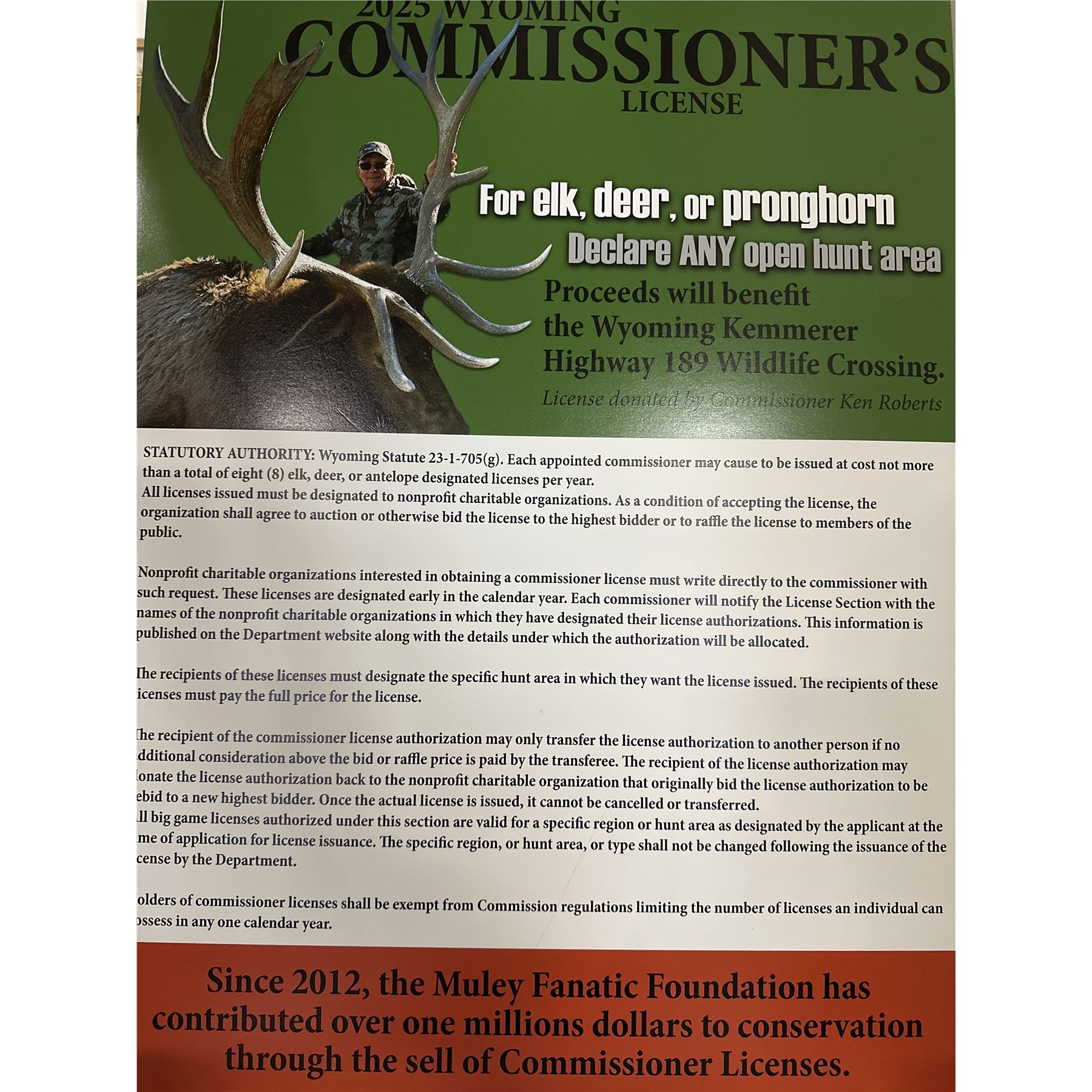 WINNER CHOOSES TO HUNT DEER, ELK, OR PRONGHORN IN WYOMING AND DECLARE ANY OPEN HUNT AREA FOR THAT SPECIES. Donated by WY Game Commissioner Richard Ladwig.