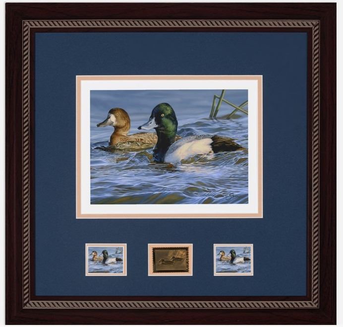 The 2026 Ducks Unlimited Stamp Print by Scot Storm showcases a beautifully detailed painting of a pair of Greater Scaup gliding smoothly across calm water, reflecting Storm’s signature realism and deep appreciation for waterfowl. As the 43rd image in the DU stamp print series and Scot Storm’s fourth contribution to this prestigious collection, this piece continues the tradition of excellence in conservation art. Each framed set includes the DU stamp print, a matched stamp medallion, a mint stamp, and an artist-signed stamp, making it a prized collectible. Framed dimensions are 19” x 18.5”.