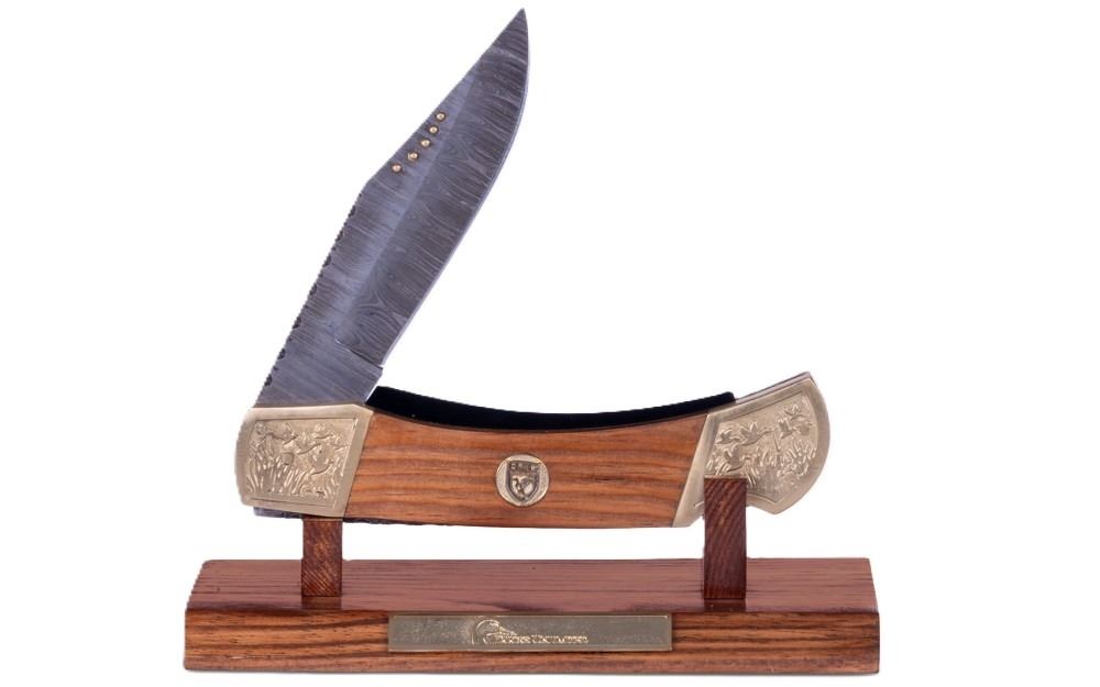 Celebrating craftsmanship and tradition, the 2026 Knife of the Year showcases a striking jumbo folder design. A Damascus blade pairs beautifully with a rich wooden handle, accented by unique duck artwork on each end and a gold crest medallion inlaid on the side. Measuring 15” overall, this impressive piece is displayed on a custom wooden stand featuring a Ducks Unlimited plate, making it a true collector’s item.