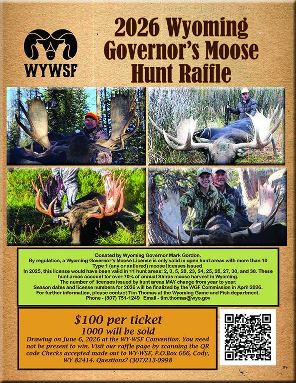 Description: This is the last Moose License Raffle Ticket that will be sold. Wyoming Governor Mark Gordon, through the Wyoming Governor’s Big Game License Coalition, is pleased to provide the Wild Sheep Foundation a 2026 Shiras Moose license. Proceeds from the sale of this license will go to the Wyoming Governor's Big Game License Coalition and provide lasting help to Wyoming's Moose populations. By regulation, a Wyoming Governor’s Moose License is only valid in open hunt areas with more than 10 Type 1 (any or antlered) moose licenses issued. In 2025, this license would have been valid in 11 hunt areas: 2, 3, 5, 20, 23, 24, 25, 26, 27, 30, and 38. These hunt areas account for over 70% of annual Shiras moose harvest in Wyoming. The number of licenses issued by hunt areas MAY change from year to year. Season dates and license numbers for 2026 will be finalized by the WGF Commission in April 2026. The successful purchaser may hunt any open hunt area with more than 10 Type 1 licenses issued. The purchaser does not have to pick a specific hunt area and may hunt different hunt areas subject to season dates. The life-time limitation on a Type 1 moose license does not apply to Wyoming Governor's Moose Licenses. The 5-year waiting period between moose licenses does not affect the ability to purchase a Wyoming Governor’s Moose license. Purchasing this license is independent of applying for a moose license through the regular draw process. The license fee ($152 for Residents; $2,752 for Nonresidents) is waived. Preference points are not affected by purchase of a Wyoming Governor’s Moose license. 90% of the auction proceeds are returned to Wyoming to fund moose projects via the Wyoming Governor’s Big Game License Coalition.