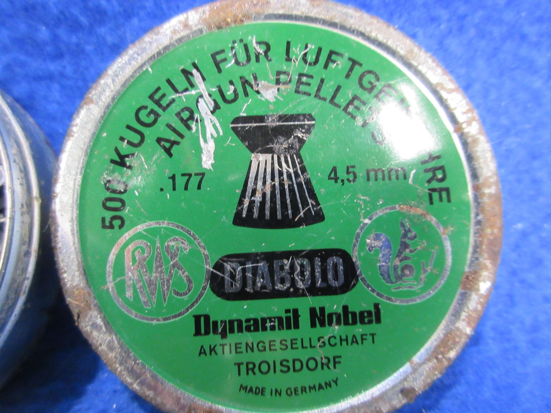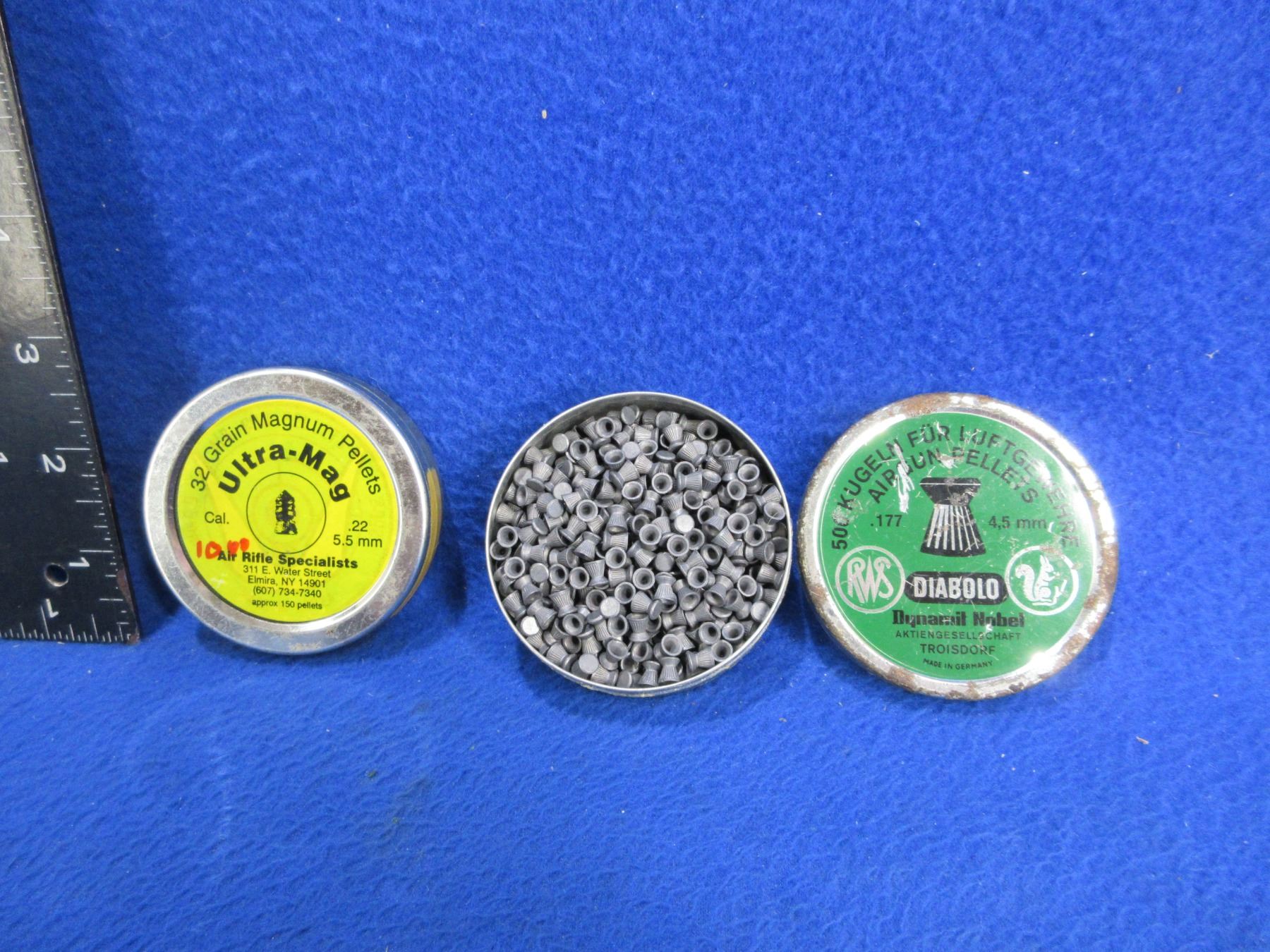 .22 Cal and .177 Cal. Pellets - Sealed Tin of 150 (.22 Cal. 32gr Ultra-Mag), Tin of 500 (Appears Full .177 Cal. RWS Diabolo)