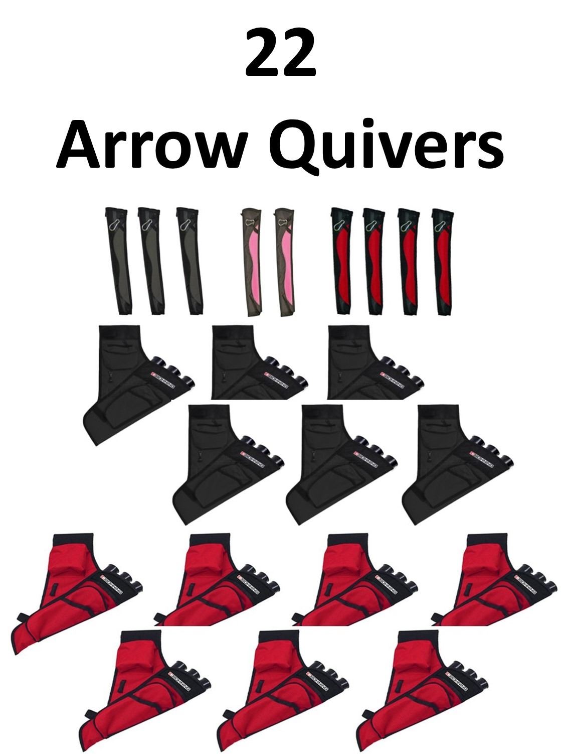 22 x Bohning Quivers, 9 x Tube Youth, 3-Grey, 2-Hot Pink, 4-Red, 13 x Mini Quivers, 6-Black RH, 7-Red RH