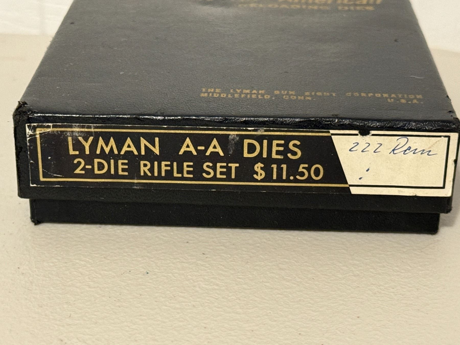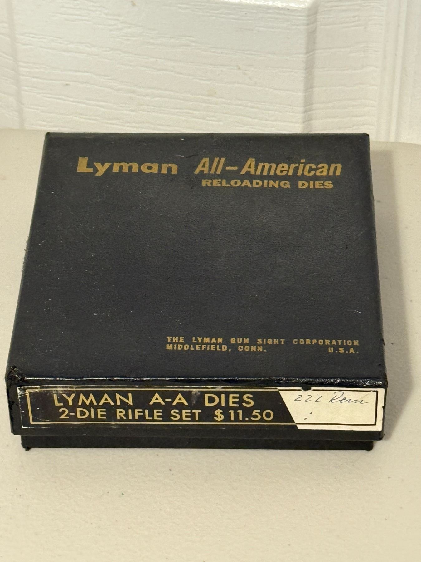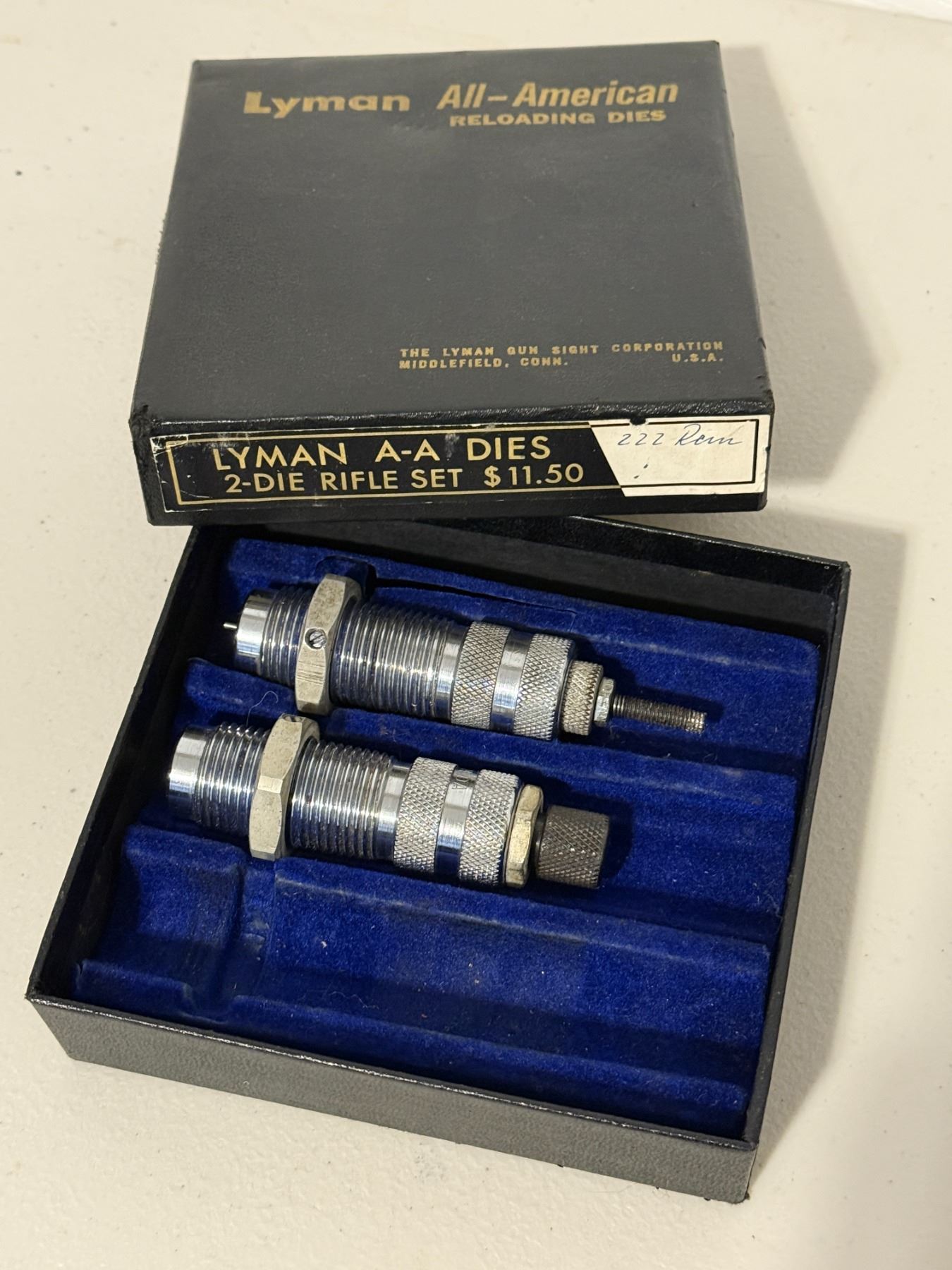 Vintage Lyman All-American 2-die rifle reloading set for .222 Remington. Includes original box and both dies as shown. Clean condition for age. Ready for your reloading bench.