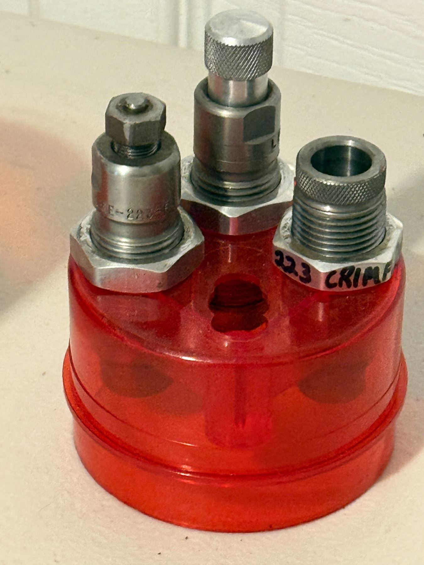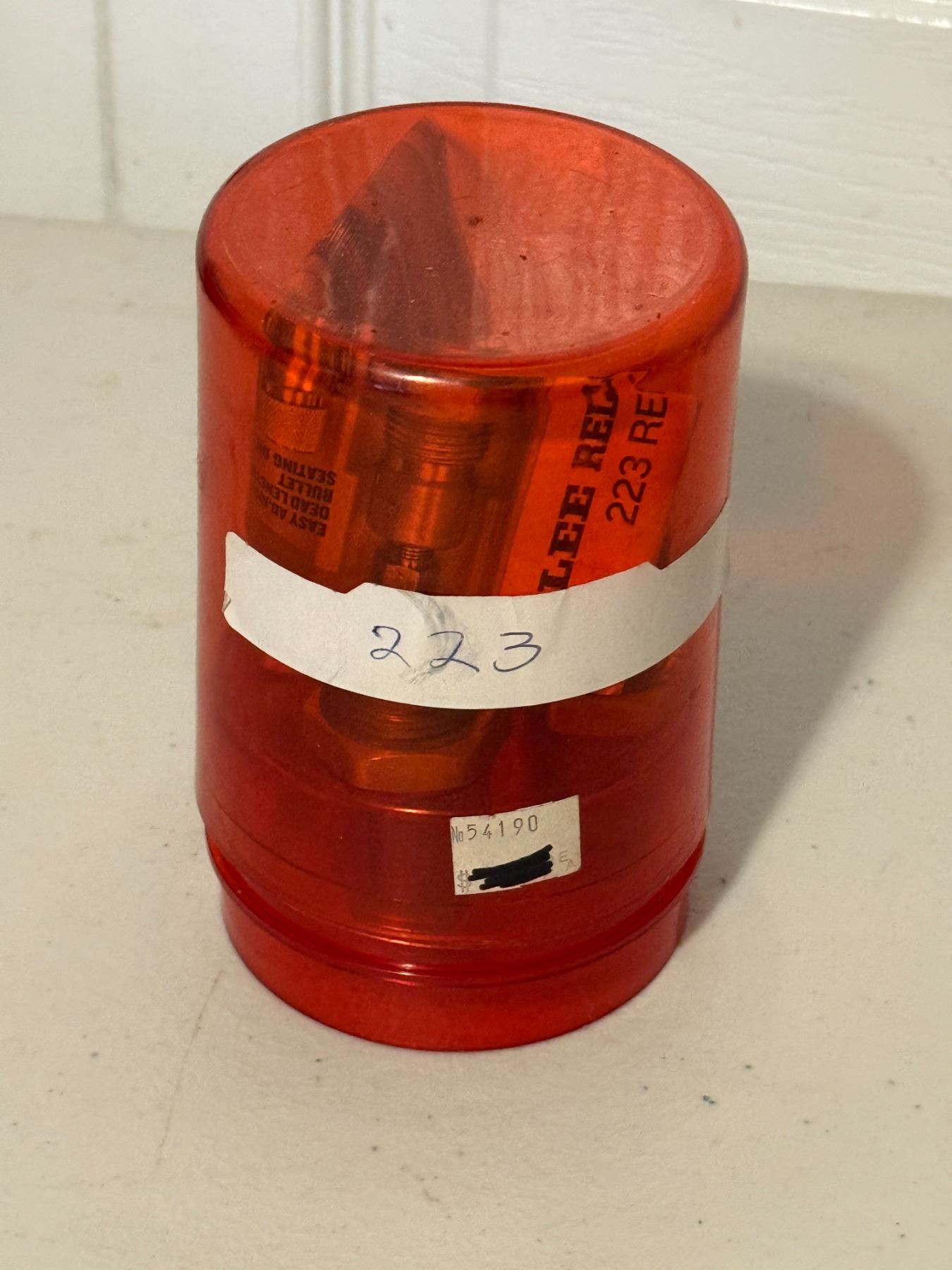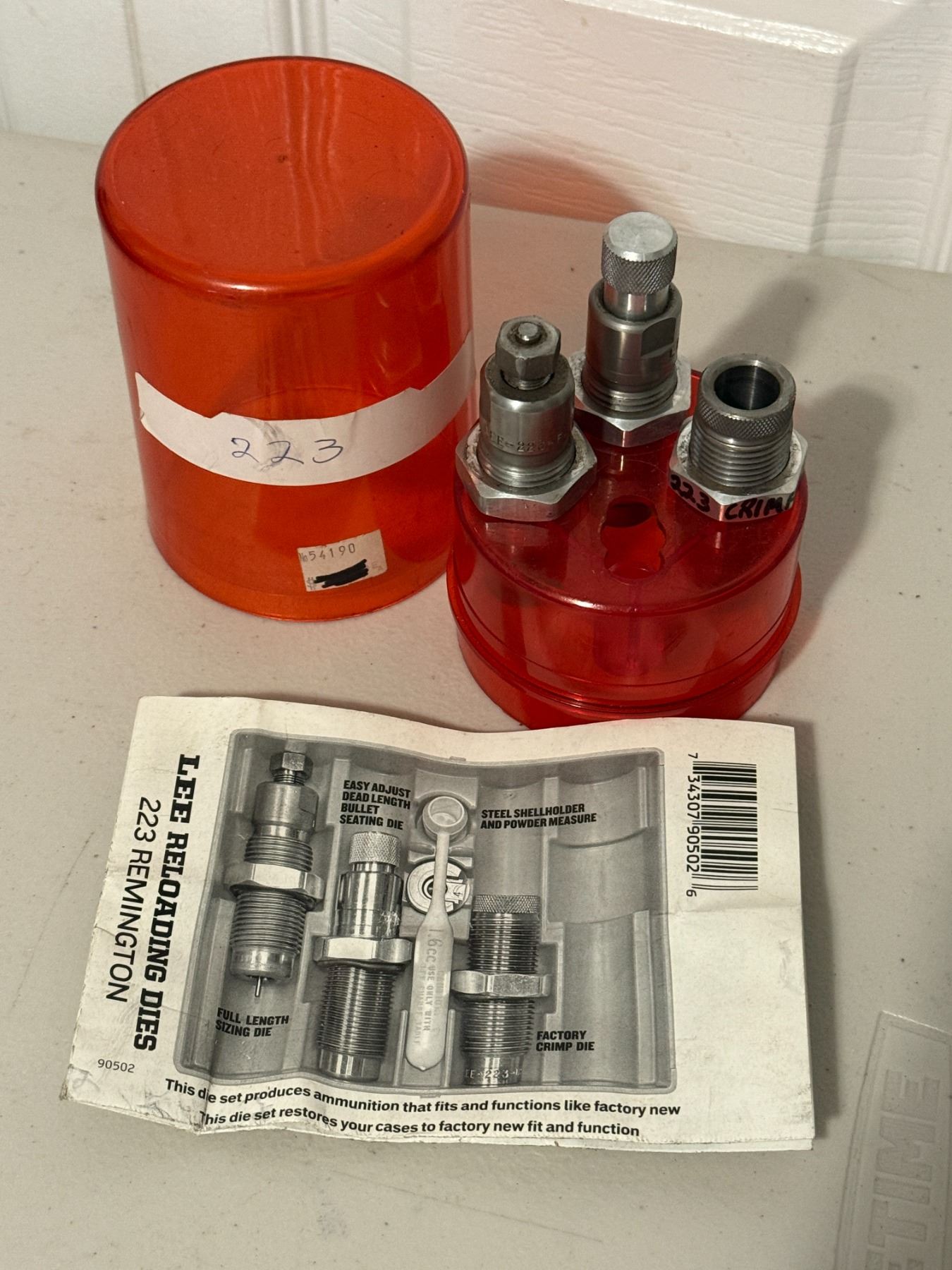 Lee .223 Remington 3-die reloading set. Includes case, dies, and paperwork as shown. Used.