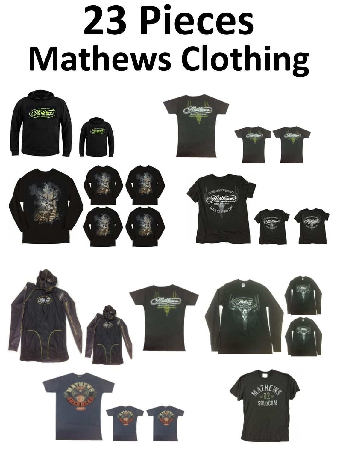 23 x Mathews Clothing, 2 x Hoodie Green Logo, 1-2XL, 1-M, 13 x Shirts, 2-Charcoal Neon Green XL, 1-Charcoal Neon Green L, 2-Elusive L, 3-Elusive XL, 1-Outfitter M, 2-Outfitter L, 3 x Black/White Skull, 1-L, 2-M, 3 x Short Shed Hunter Blue, 1-M, 1- L, 1-XL, 1 x Charcoal Neon Green M, 1 x Scout 2XL, 2 x Performance Hoodie, 1-L, 1-XL