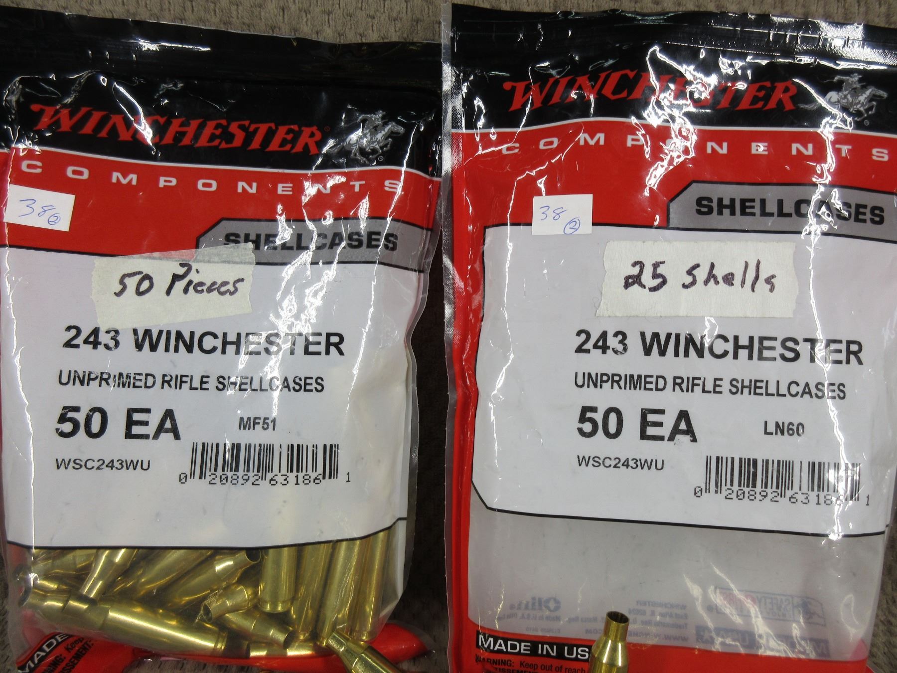 243 Winchester Brass - 2 Bags total of 75 pieces