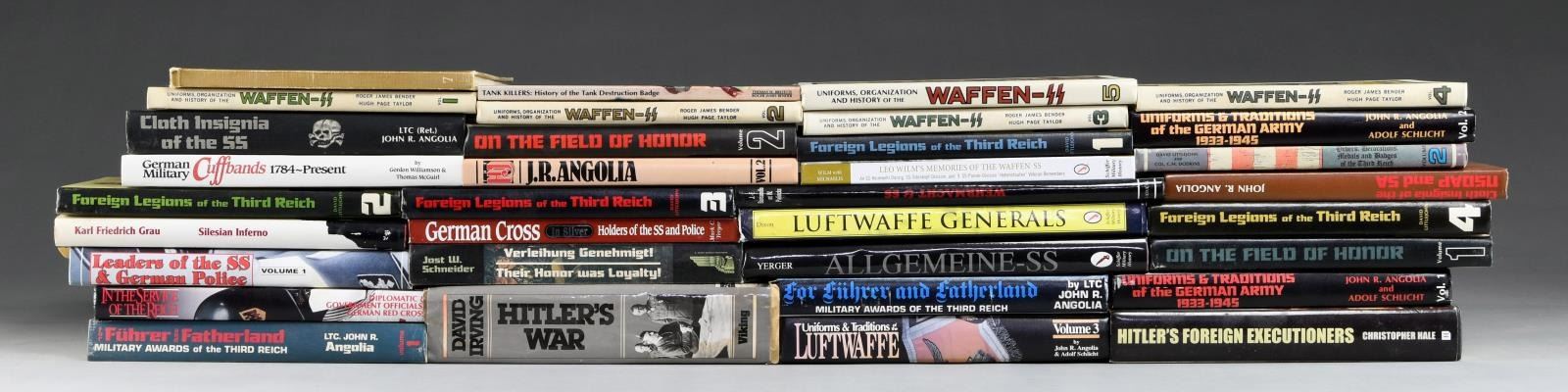 DURING WWII. "SILESIA INFERNO". "Leo Wilm's Memories of the Waffen-SS" by Rolf Michaelis. "Cloth Insignia of the NSDAP & SA" by John R. Angolia. "An Illustrated and Documentary History of the Knight's Cross Holders of Waffen-SS and Police, 1940-1945" by Jost W. Schneider. "Hitlers Foreign Executioners: Europes Dirty Secret" by Christopher Hale. "Hitler's War" by David Irving. "Allgemeine-SS: The Commands, Units and Leaders of the General SS" by Mark Yerger. "Wehrmacht & SS; Caucasian, Muslim, Asian Troops" by Borsarello. "Luftwaffe Generals" by Jeremy Dixon. "Volumes I, 2, 3, 4 & 5 of "Uniforms, Organization and History of the Waffen SS by Roger James Bender. "Leaders of the SS & German Police : Volume 1" by Michael Miller. "GERMAN CROSS IN SILVER HOLDERS OF THE SS AND POLICE" by Mark Yerger. Vols. 1-4 "Foreign Legions of the Third Reich". Vols. 1-2 "On the Field of Honor : A History of the Knight's Cross Bearers" by John Angolia. Vol. 1 & 2 "Uniforms & Traditions of the German Army 1933-1945" by John R. Angolia. "Tank Killers : History of the Tank Destruction Badge" by Breyette Thomas. "Cloth Insignia of the SS" by John R. Angolia. "For Fuhrer and Fatherland Military Awards of the Third Reich" by John Angolia. "IN THE SERVICE OF THE REICH" by JOHN R. ANGOLIA . "For Fuhrer and Fatherland: Military Awards of the Third Reich" Revised edition by John R. Angolia. "Uniforms & Traditions of The Luftwaffe, Volume 3" by John Angolia. "Uniforms of the SS : Volume 7 Waffen -SS Badges and Unit Distinctions 1939-1945" by Andrew Mollo. "Orders, Decorations, Medals and Badges of the Third Reich: Volume 2" by David Littlejohn. "THE HJ (Hitler Youth) Vol 2" By John R. Angolia. "German Military Cuffbands, 1784-Present" by Gordon Williamson. CONDITION: books in fair to good overall w/ wear & tear commensurate w/ use. Some pages have owner's marks, but balance very good. (02-19630-3/MD). $800-1,100.