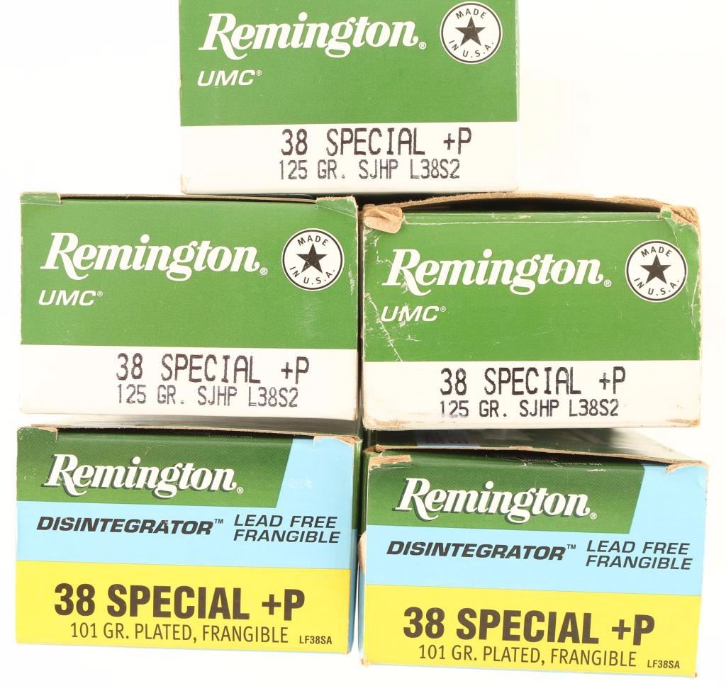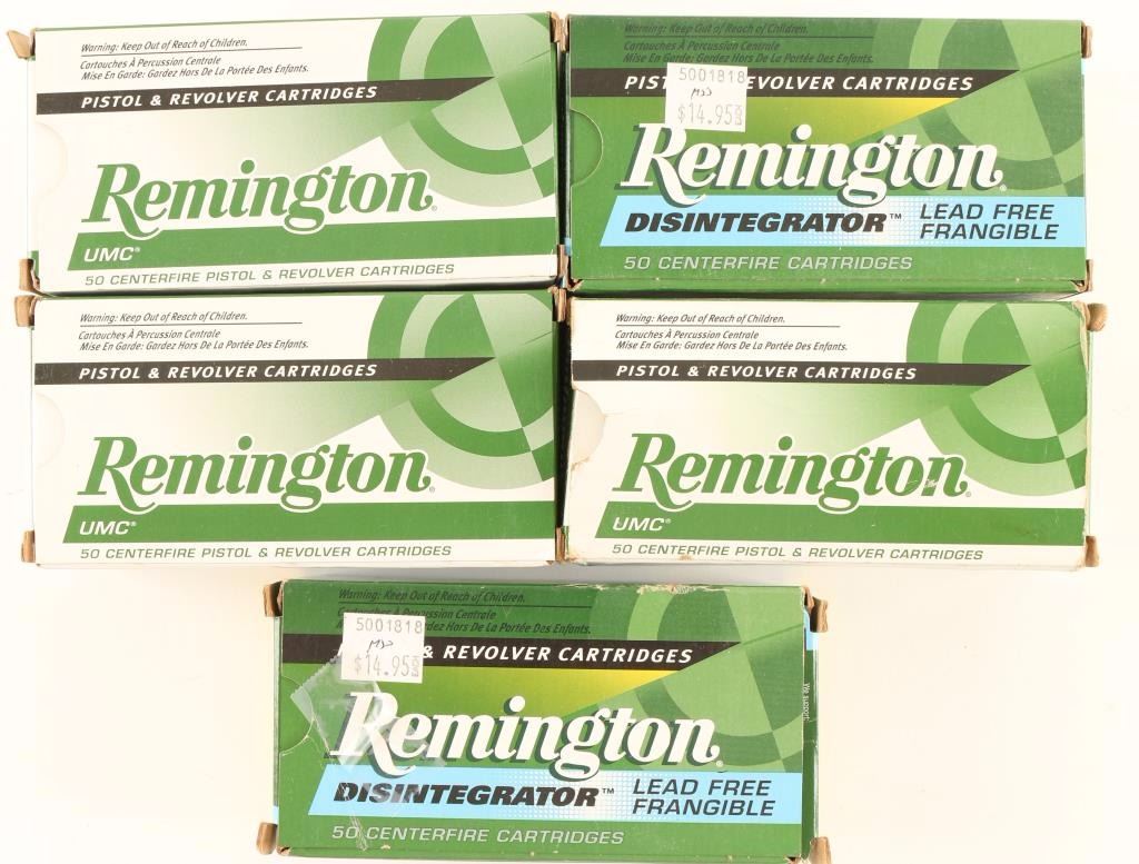 Consisting of three 50 round boxes of Remington UMC 125 grain semi-jacketed hollow point, and two 50 round boxes of Remington Disintegrator lead free frangible 101 grain plated ammunition.