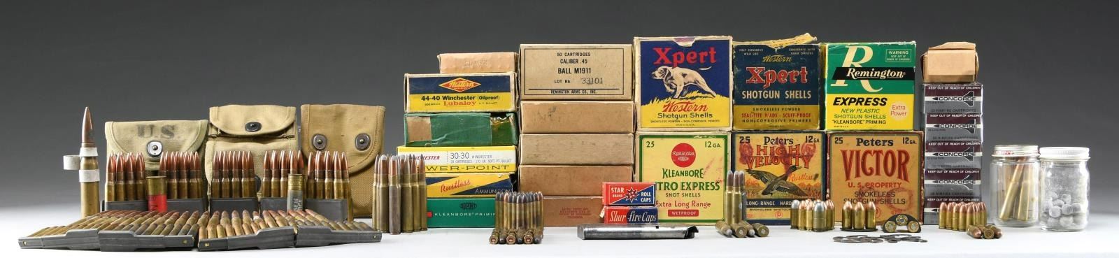 LOT CONTAINS ARMOR PIERCING AMMO. 22 LR: 500 Rds. (10 Boxes) Concorde 40 gr. 250 (6 Boxes) OF M1911 BALL; balance WRA w/ some mixed. 17 Rds. loose. 30-06: 20 Rds. (1 B0x) Rem. 150 gr. ptd soft point. 17 Rds. (1 Box) Peters 180 gr. soft point. Box in poor condition. 40 RDS. ball in 5 M1 Garand clips. 25 RDS. balls in 5 stripper clips. 1 Box containing 5 rds. Rem. black tip armor piercing & 4 rd. Win. soft point. 30-30: 20 Rds. (1 Box) Win. 170 gr. soft point. 30-40 KRAG: 10 Rds. soft point. 8MM LEBEL: 10 Rds. Kynoch on clips. 7.62x54R: 10 rds. in 2 stripper clips. 30 CARBINE: 40 Rds. on stripper clips & 30 rds. loose. 44-40: 25+ Rds. (1 Box) Western 200 gr. soft point. 50 BMG: 1 rd. loose ball. 300 Savage: 7 rds. loose soft point. 9MM LUGER: 16 rds. (1 Box) German 1944. 25 Rds. (1 Box) Interarms. 20 Rds. Loose 12 Ga., 2 3/4": 25 Rds. (1 Box) Peters US Property 00 Buck 19 RDS. (1 Box) Western US property 00 BUCK. 19 RDS. (1 Box) Peters #4. 12 RDS. (1 Box) Rem. Kleanbore 7 1/2C. 16 GA., 2 3/4": 25 Rds. (1 Box) Rem. 1 buck. 16 Ga., 2 9/16": 18 Rds. (1 Box) Western #4. Box in poor condition. MISC: 1 Two tone 1911 7 rd. mag. 2 Two tone WWI 1911 7 rd. mags. w/ lanyard loops contained in HB &CO dbl. mag. pouch. Belt pouch for M1917 half moon clips w/ 8 rds. 10 Half moon clips in bag. M1 Carbine dbl. mag. pouch w/ 2 KSG 15 rd. mags. 1 Jar of 15+ lead projectiles including Minie style bullets. 3 Boxes Shur Fire caps. CONDITION: ammo appears in serviceable condition w/ boxes ranging from poor to good. (02-19604/MD). $200-400.