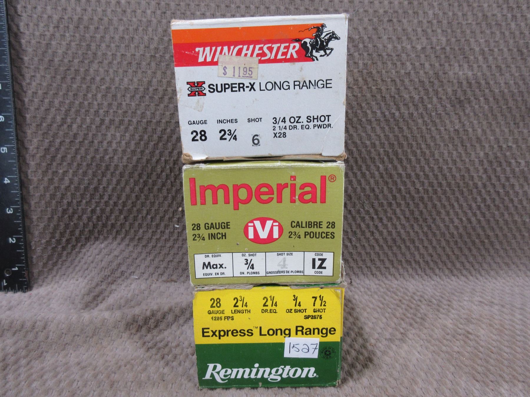 28 Ga. 2 3/4" - 3 Various Boxes - Box of 25 Rem. 7 1/2 Shot, Box of 18 Win. 6 Shot, Box of 23 Imp. 4 Shot