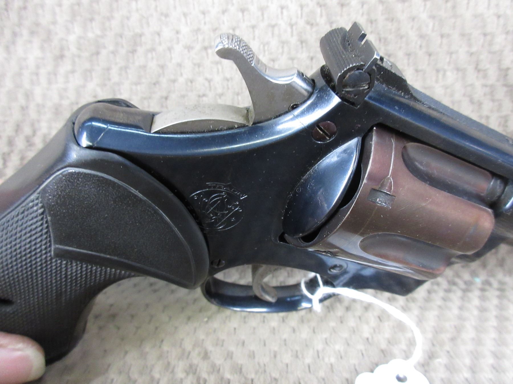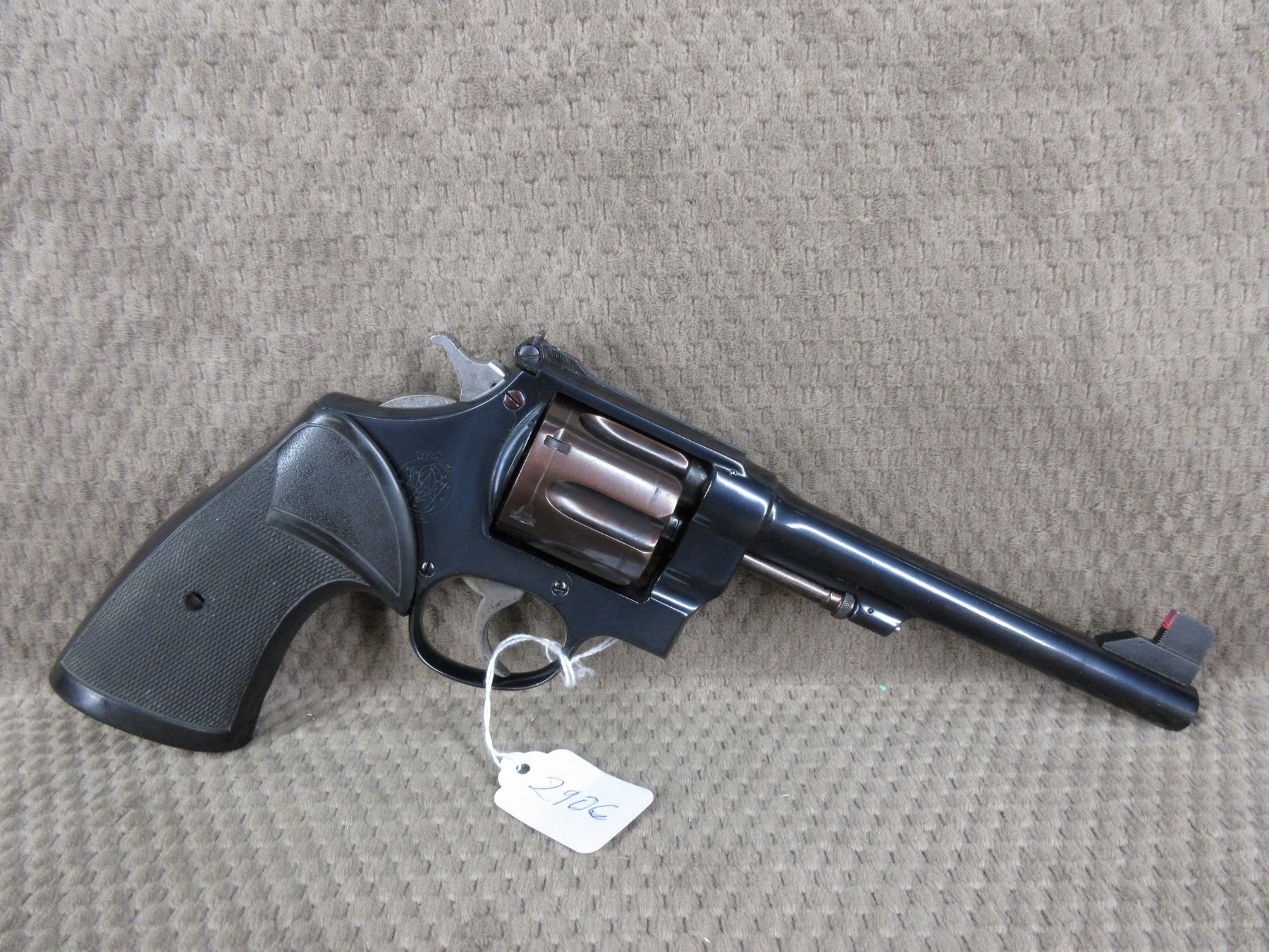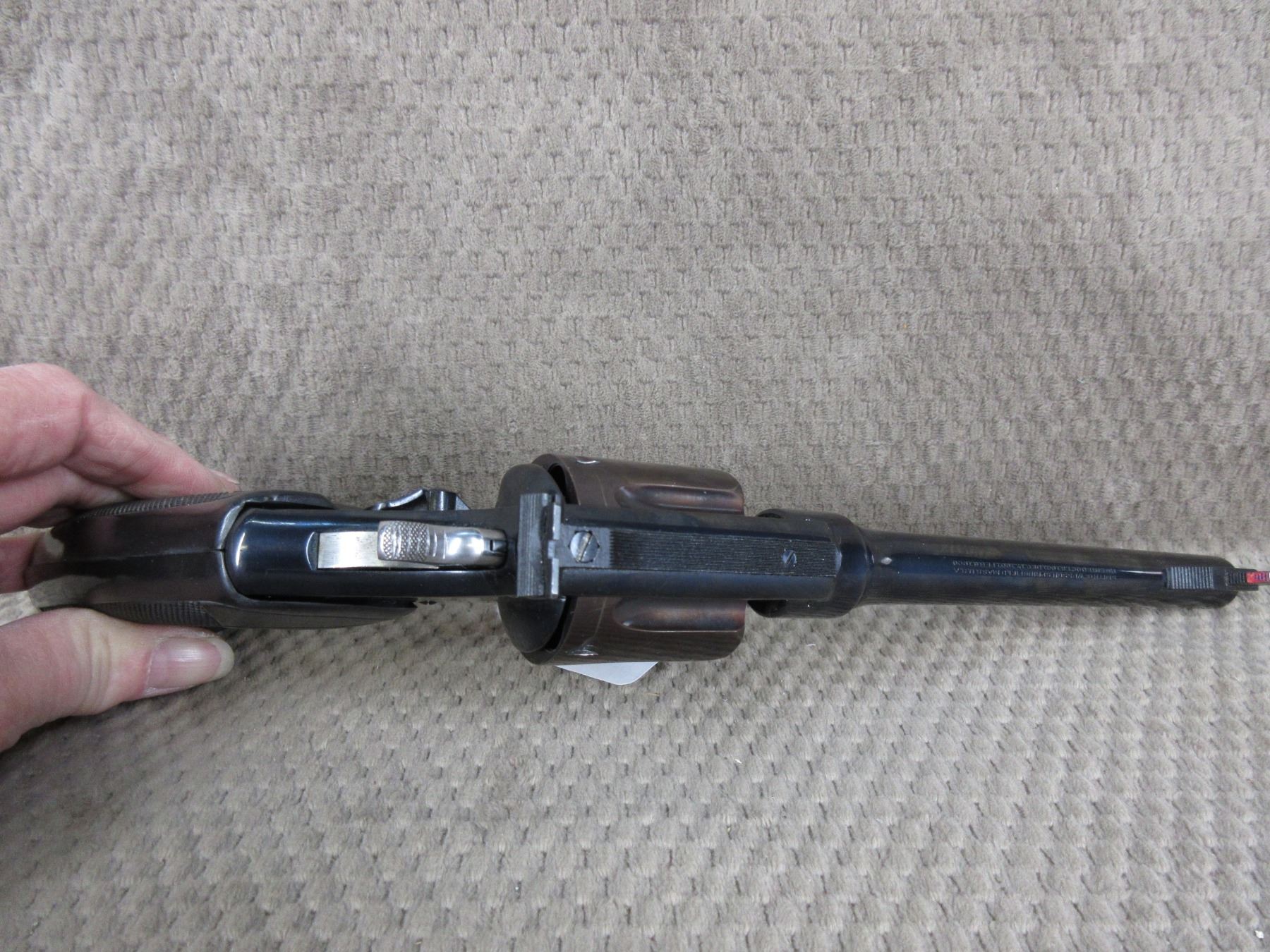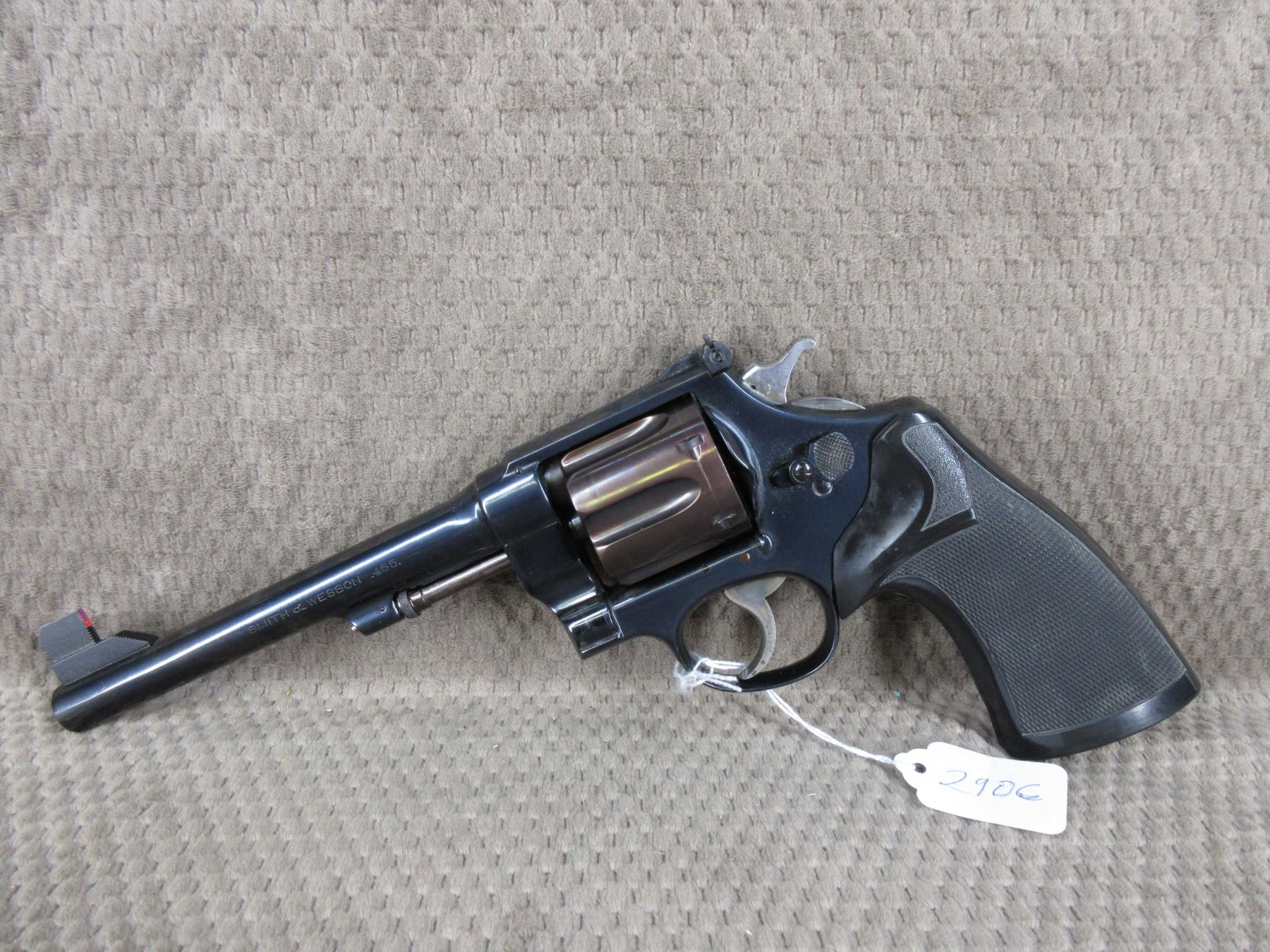 Restricted - Smith & Wesson 455, Hand Ejector, Second Model in 45 Long Colt - This double action revolver six shot revolver appears to be in very good working order. Barrel is 165MM, gun has been reblued and cylinder was browned and both are excellent, rifling is very good, has target sights added, grips are Presentation Grip by Pachmayer.