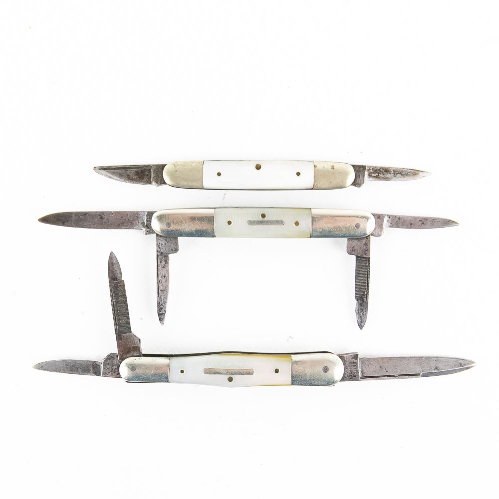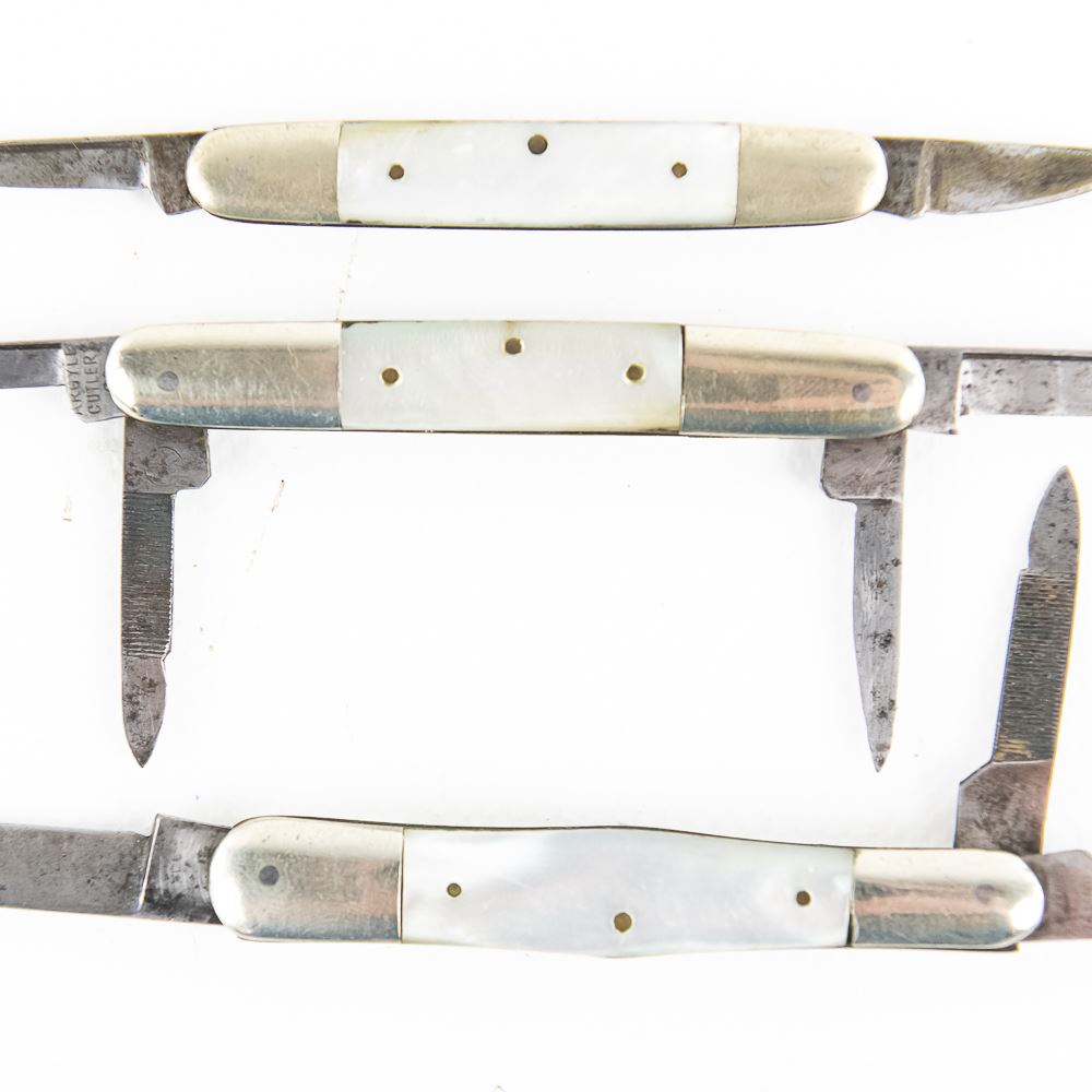 3 early 1900s German made pocket/pen knives. All knives have Genuine Mother of Pearl handles. Makers mark are Argyle, United Cutlery Co, and Western Cutlery. Knives are all used but in fair to good condition. Handles do show some chips, but would display well. 2.5-3" closed length. Nice instant collection of very interesting knives. See photos.