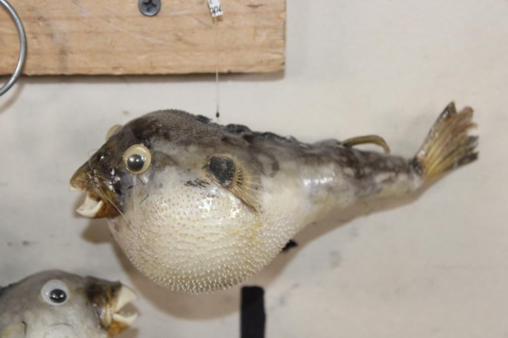 3 BLUNTHEAD PUFFER FISH with Ceiling hangers. These fish have a unique defense mechanism! They can inflate their bodies with water or air to appear larger and deter predators. The lifespan of the Blunthead Puffer can range from 3 to 20 years with an average of around 10 years. (ONE$) TAXIDERMY FISH