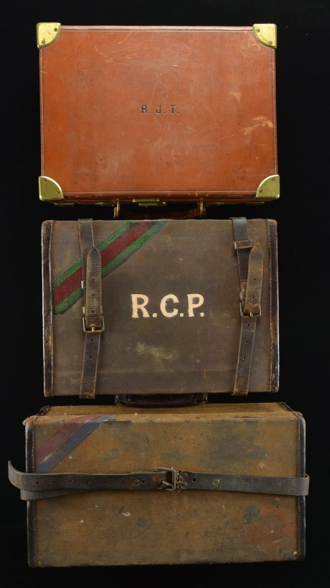 1) Best oak and leather with James Purdey label 16" x 11 1/2" x 5", with brass corners, top is embossed "R.J.T. ", interior of lid is lined in burgundy cloth and has Purdey label and notice label regarding cartridges. CONDITION: fine, leather still light in color with a few scuffs. Handle good, straps missing. Interior cloth is good, labels foxed and lightly soiled. Interior varnish good, 3 partitions and leather retaining straps are missing. A reproduction key is included. 2) Oil cloth and leather case with T. W. Murray & Co. Cork Ireland 12" x 16" x 5" green and red paint on top also painted with the initials R.C.P. in white. Interior of lid is lined with tan canvas, gold embossed Murray label is on red Morocco leather. CONDITION: very good to fine, exterior dark, leather trim with rubs, straps and handle are good, interior is good to fine, showing some water damage, label is fine somewhat stained from water, interior retains all dividers and leather straps. An old key is included which does not work. 3) Entry level brown canvas and leather, 18 1/2" x 10" x 6", lined in blue and white ticking. CONDITION: good, many stains and marks on exterior, old strap shows repair, interior good, considerably soiled. (02-17738/MGM). $300-600.