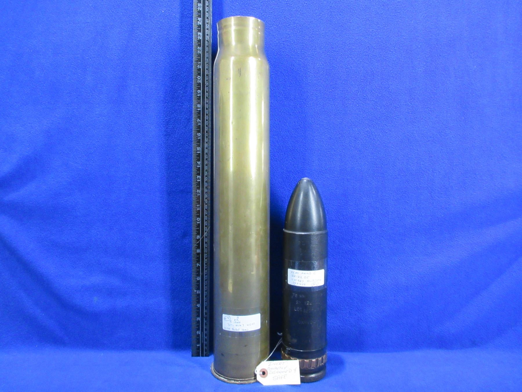 3" Brass Shell Casing with 76MM Bullet - PICK UP ONLY - Shell Casing Marked "A EK 9-1944 3" MK7 WEM", Bullet Marked "76MM ARMD C SX 122 GE Lot 287 RLB 3/70 DXP 4041