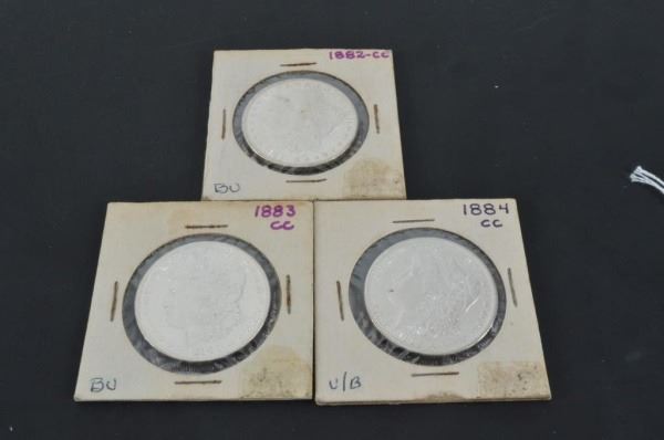 3 Uncirculated Carson City Silver dollars. 1882, 1883, and 1884