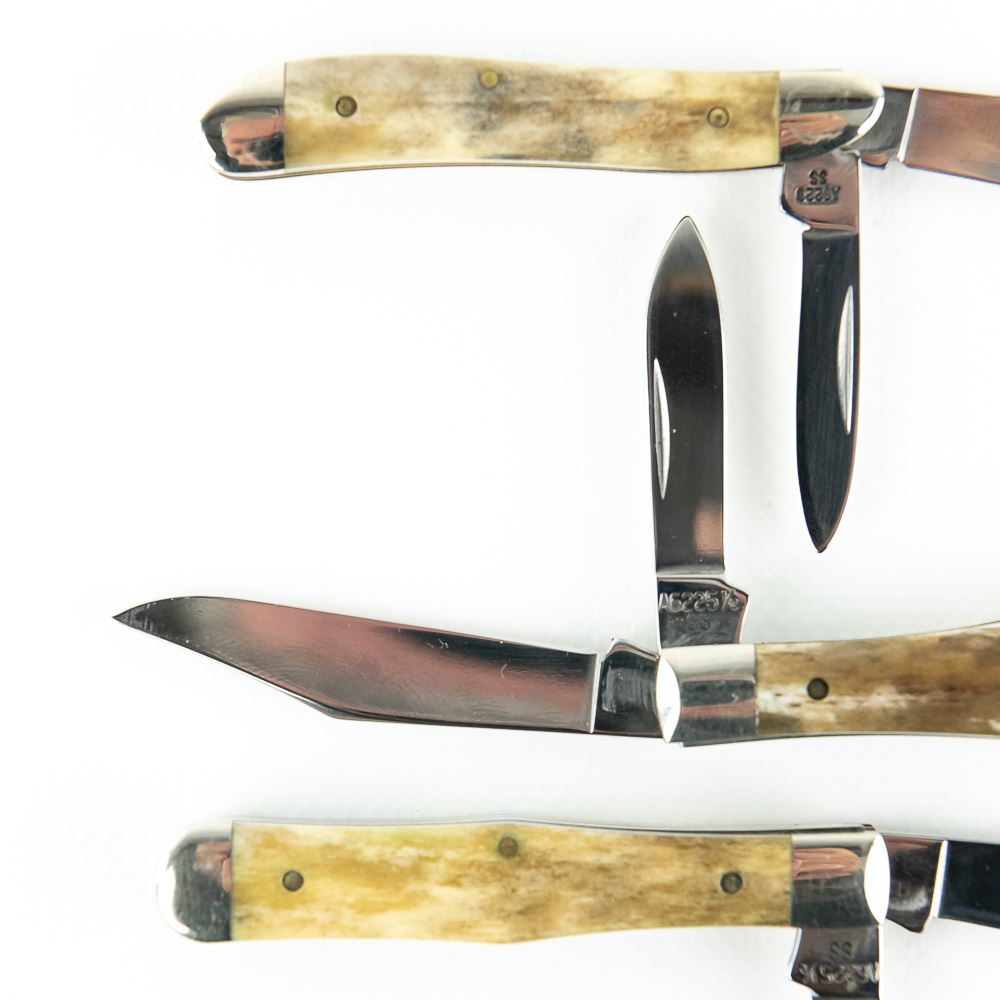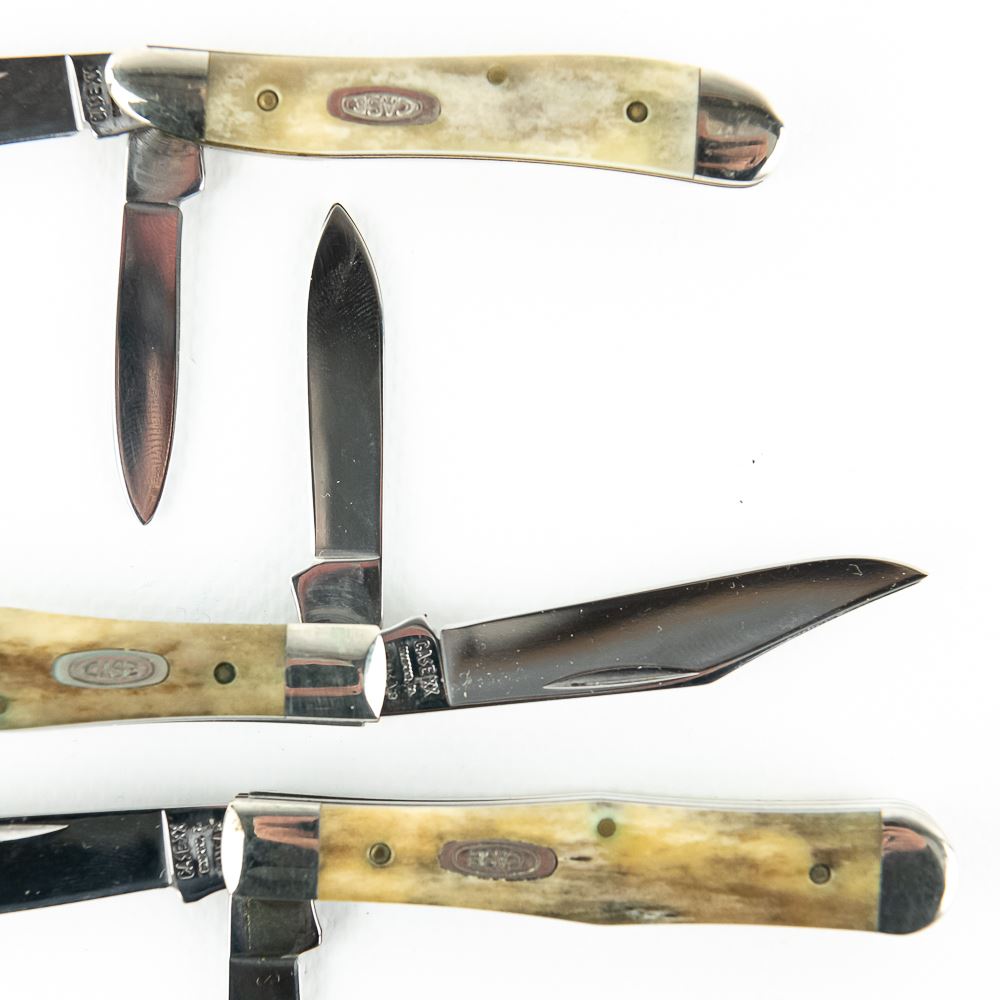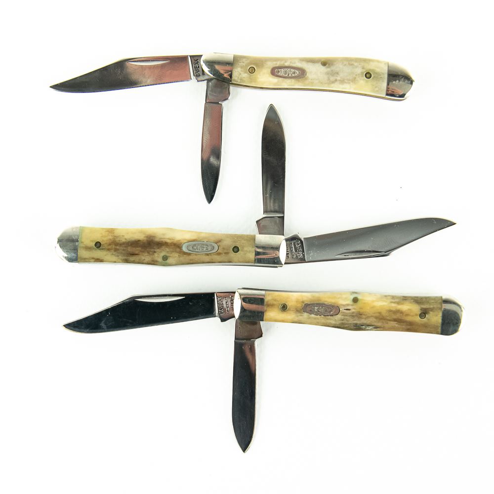 3 Case XX USA made pocket knives. 1990s production knives are all in like new condition with only storage wear on bolsters. 2 different models with similar smooth bone style handles, 1 A6220SS, and 2 a6225 1/2SS. 2.8-3" closed length. Nice instant knife collection. See photos.