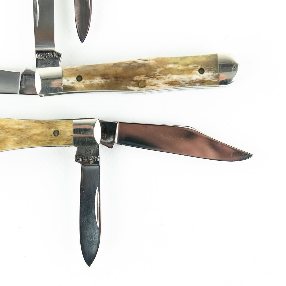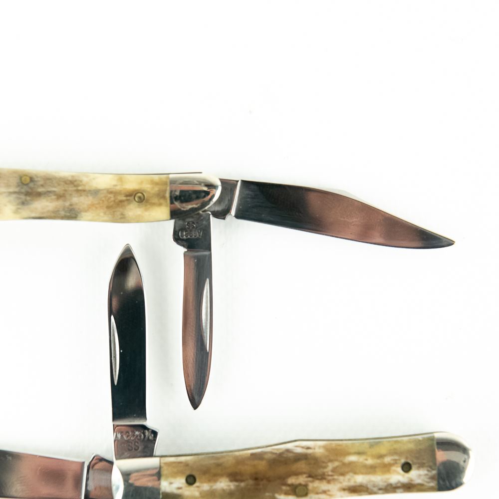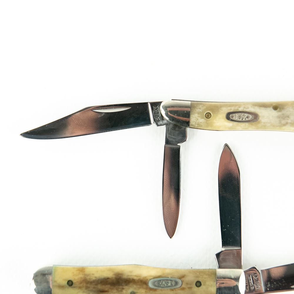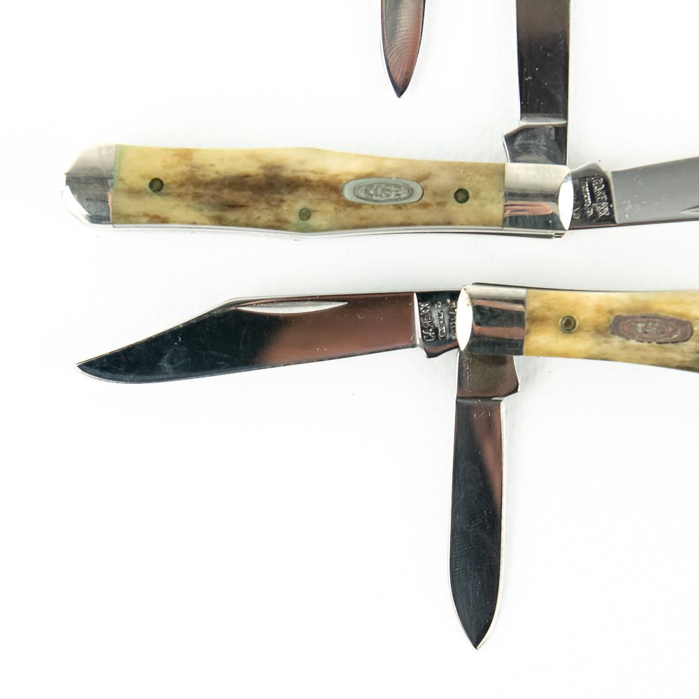 3 Case XX USA made pocket knives. 1990s production knives are all in like new condition with only storage wear on bolsters. 2 different models with similar smooth bone style handles, 1 A6220SS, and 2 a6225 1/2SS. 2.8-3" closed length. Nice instant knife collection. See photos.