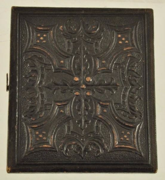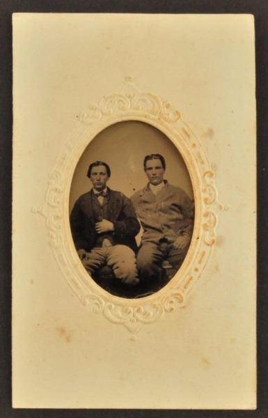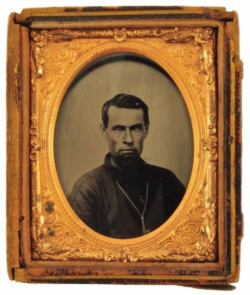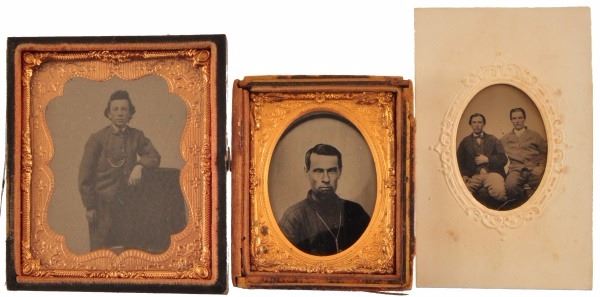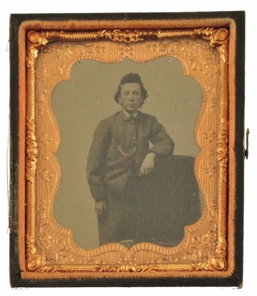 1/9th Plate Ruby Ambrotype Period Copy Of Photo (Man in pleated battle shirt. Half case missing. 2" x 2-1/2"). 1/6th Plate Ambrotype Photo, Youth in shell jacket with piping on cuff. Same type of uniform worn by 18th & 19th Louisiana Infantry. Comes in half case, lid missing. 3-1/4" x 2-3/4". Small Tintype Photo Of Civilian & Rebel, Rebel is wearing a 6 wood button shell jacket with top bottom missing, stand up collar, and some emulsion loss above his head. 2-1/2" x 4"