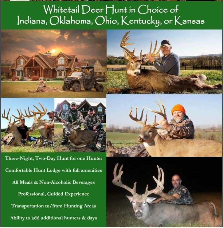 3 day, 2 night hunt for 1 hunter in your choice of the following states: Indiana, Oklahoma, Ohio, Kentucky, or Kansas)! All lodging, meals, and non-alcoholic drinks provided. Professional guide service included. Includes transportation to/from hunting areas. Ability to add days or additional hunters.