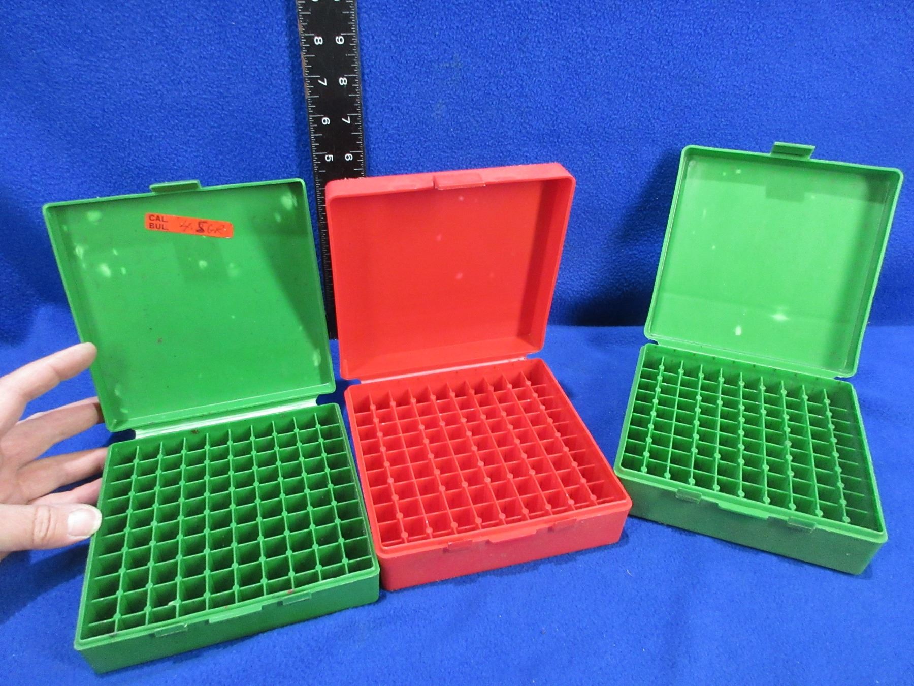 3 Empty MTM P100 Plastic Ammo Boxes - 45 Cal., Etc.