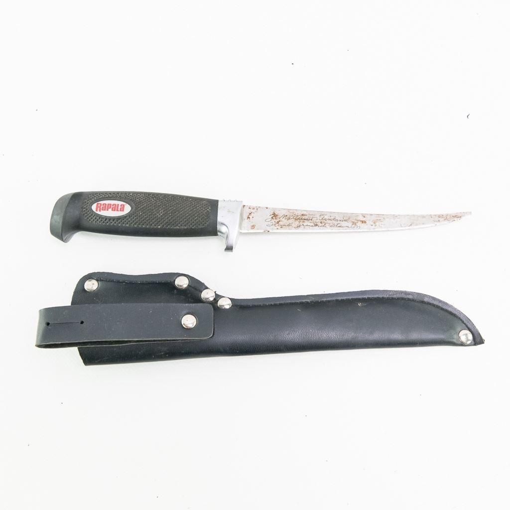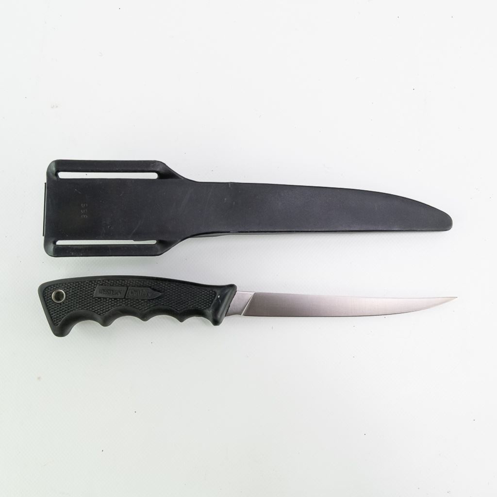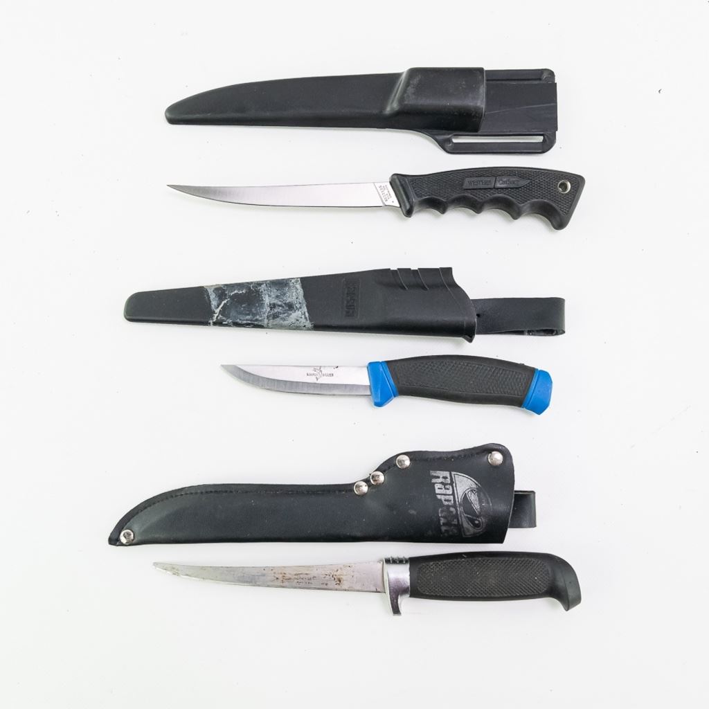 3 Filet Knives, 1 Vintage Rapala Finland made, 1 new China made, 1 Western Cutlery USA made. Condition Varies. All come with belt Sheaths. See Photos.