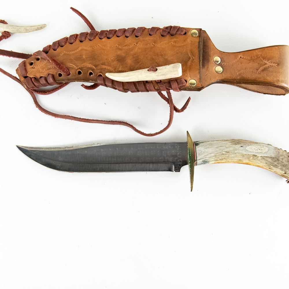 3 large hunting/ Bowie Style knives. Two appear to be hand finished and have intricately made stag handles. One of the stag handle knives has a Damascus steel blade. All appear to be brand new and come with leather sheaths. The two hand built knives have sheathes that are high quality leather. 16-18" overall length. See photos.