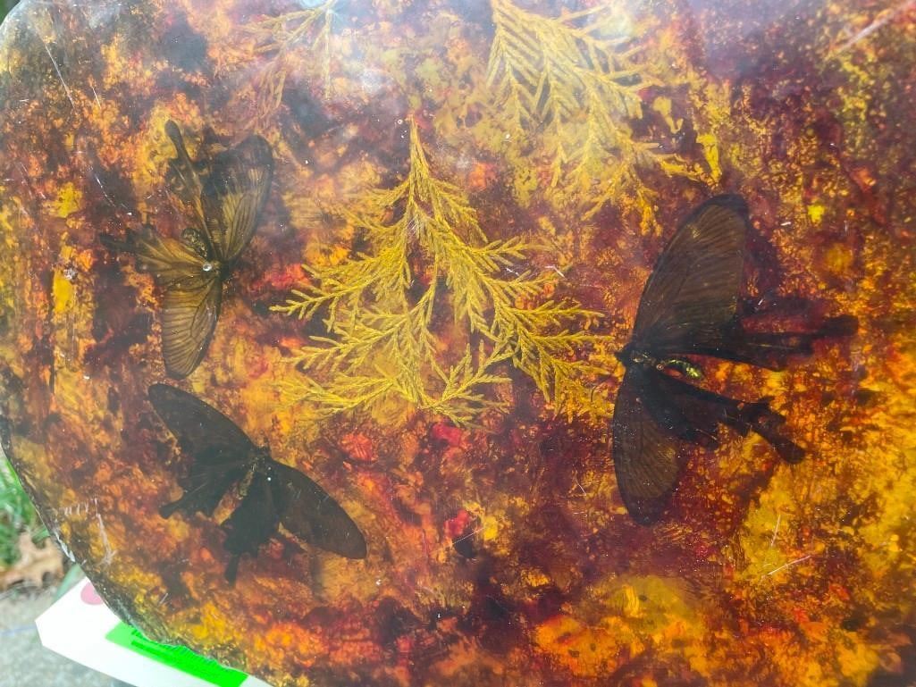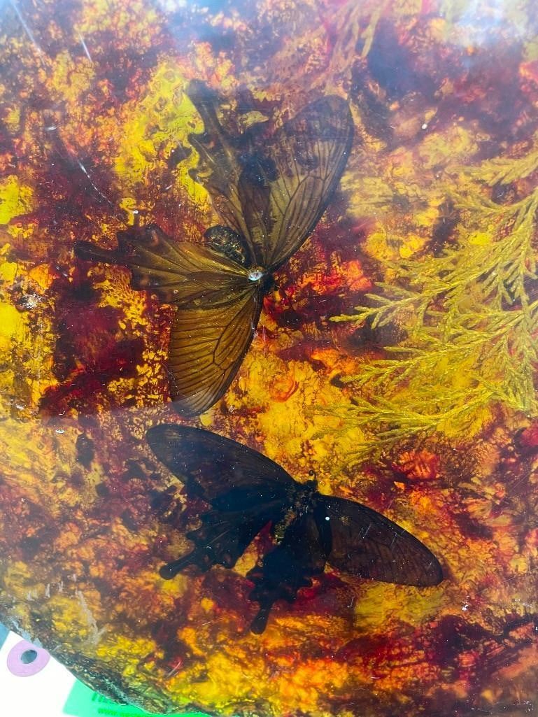 Very realistic looking! Simulated AMBER Specimen with 3 MOTHS inside. It measures 12" Long x 10" Wide and comes with a Display Stand. Great Oddity Taxidermy or Science Decor. TAXIDERMY WITH ROCKS AND FOSSILS