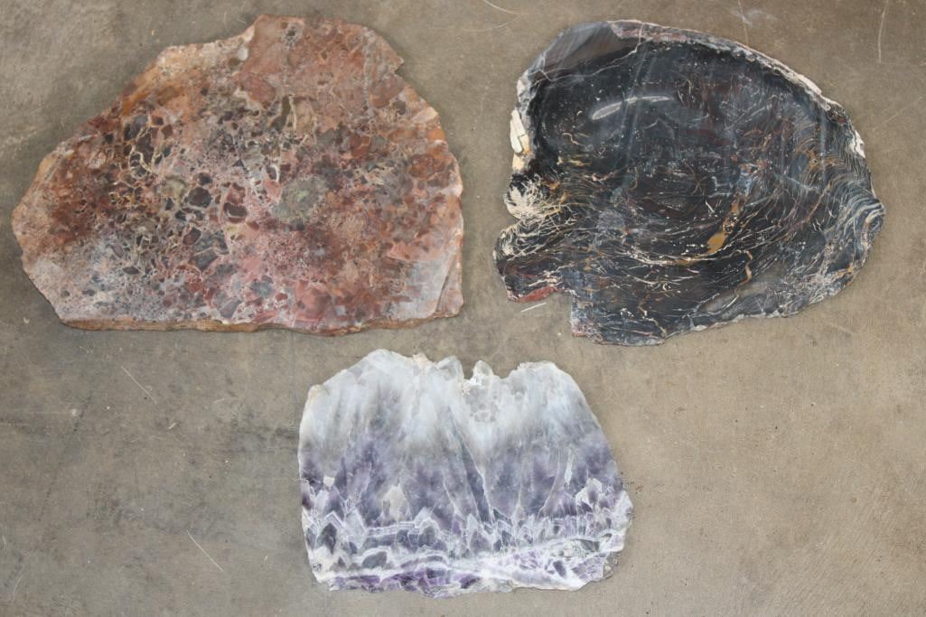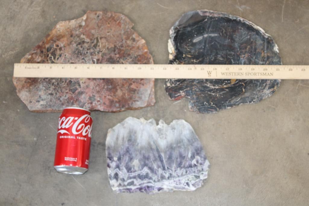 3 Mineral Slab Slices. 1 JASPER Slice, 1 PETRIFIED FOSSILIZED Wood Slice, and 1 DREAM AMETHYST Slice. The Total Weight is 6 lbs 4 oz. (ONE$) ROCKS FOSSILS MINERALS