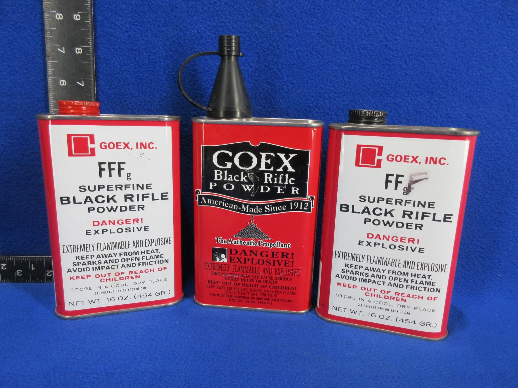 3 Open Tins of Goex FFFg Black Powder - PICK UP ONLY - 1 tin appears 3/4 full and markings are changed from FFg to FFFg, other 2 tins appear 1/4 full or less