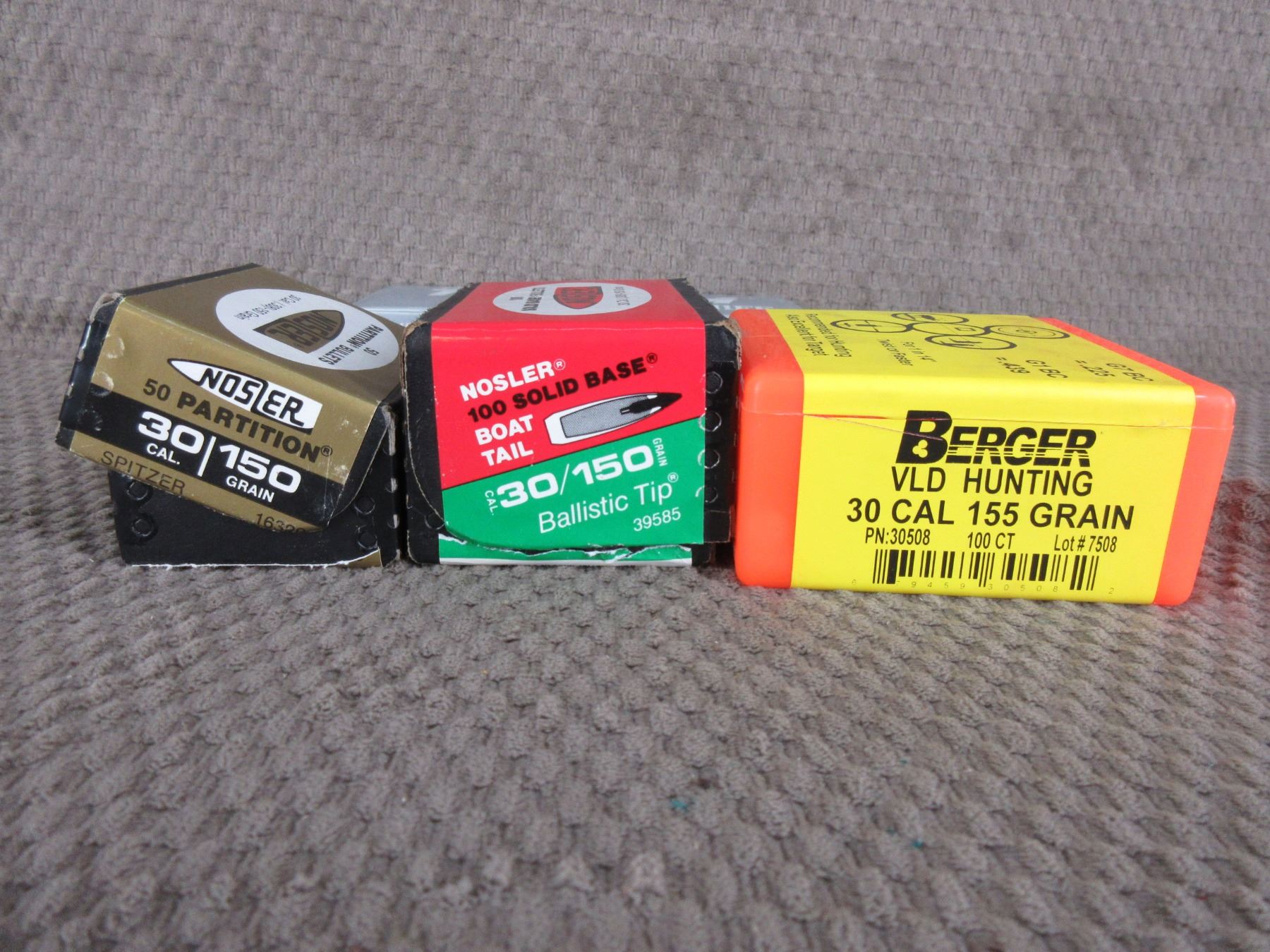 3 Opened Boxes of Bullets - Berger 30 Cal 155gr, VLD - Nosler 30 Cal 150gr, Spitzer - Nosler 30 Cal 150gr, Balistic Tip