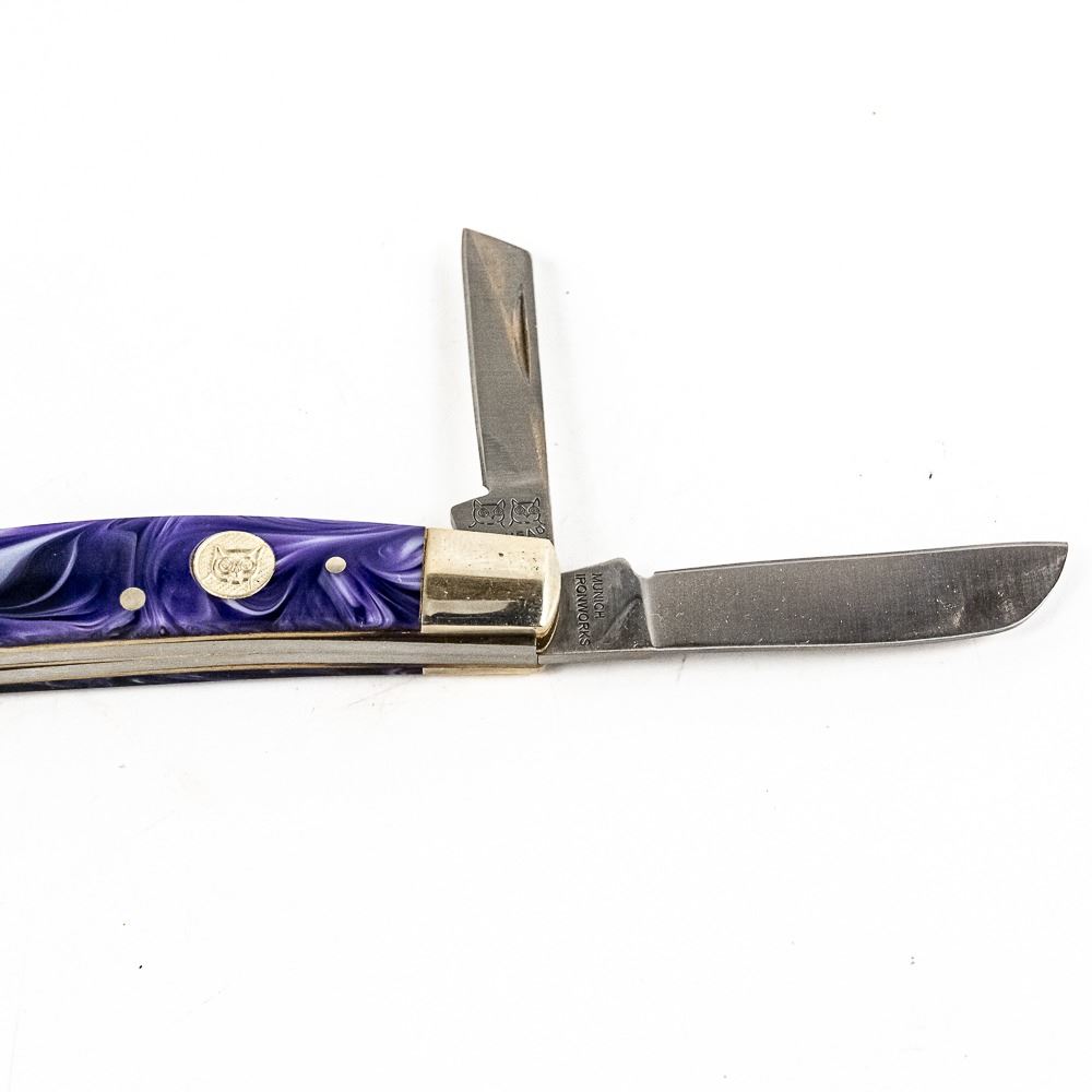 3 Owl Head Munich Germany made Whittler Knives. 2 4 blade congress, and 1 4 blade round end congress. 3 different colors of pearlescent handles. All 3 are like new with only minor storage wear on bolsters. Excellent gift or collector items. 3.5-4" closed length. See photos.