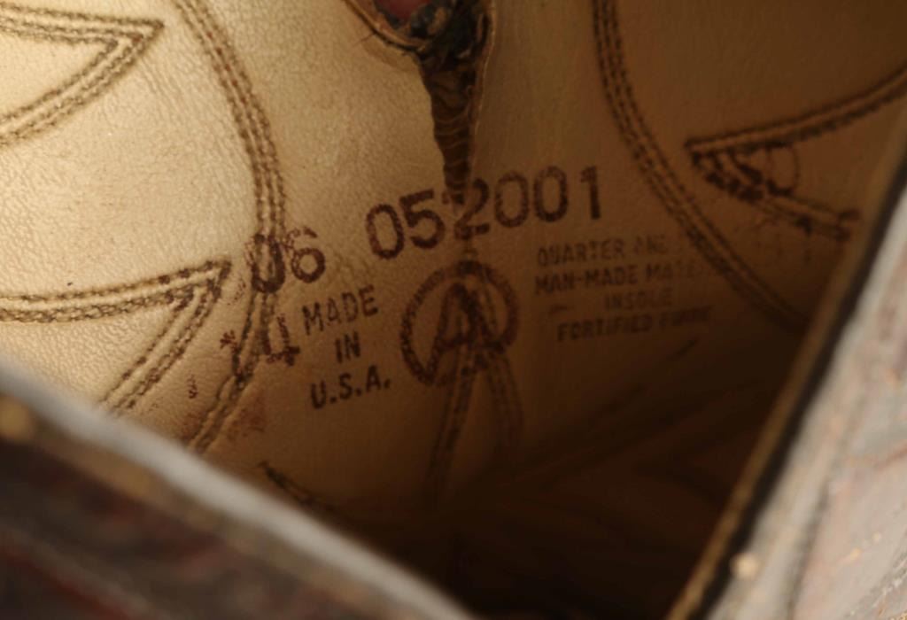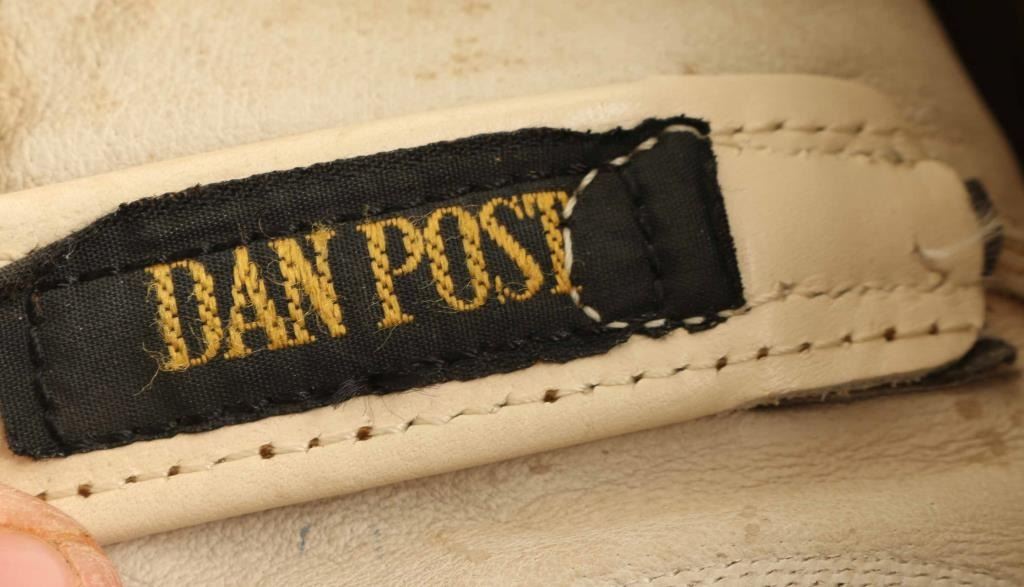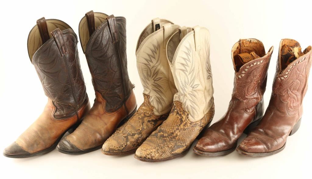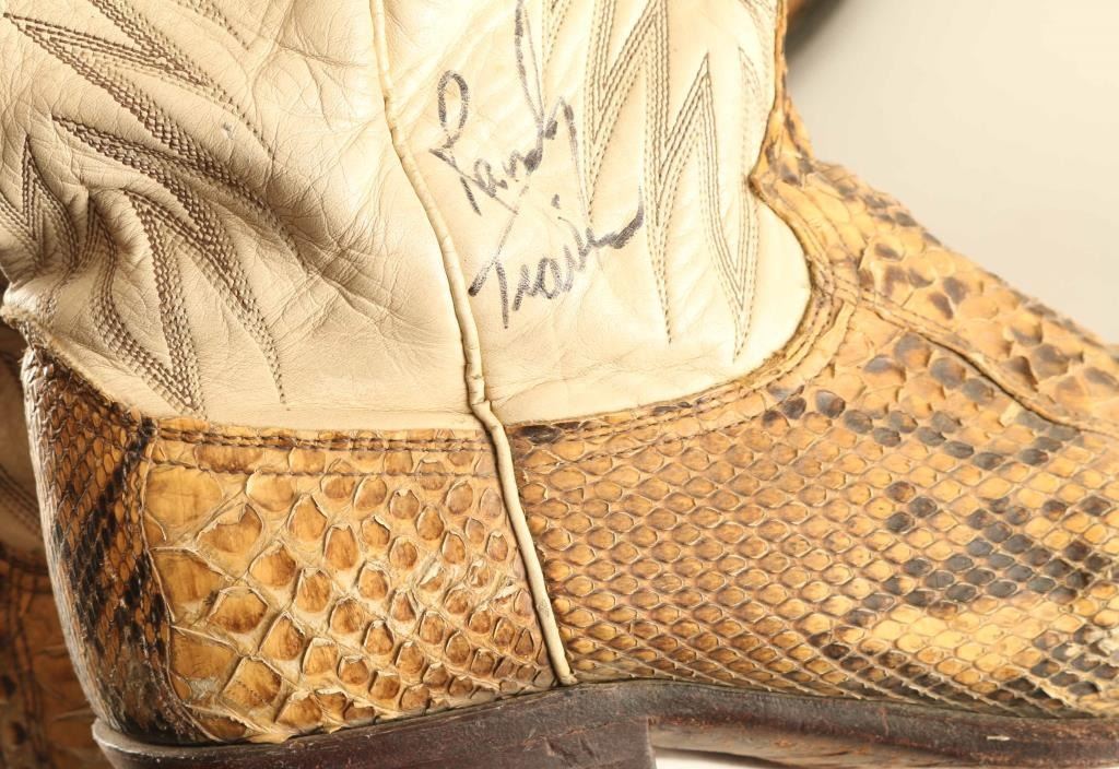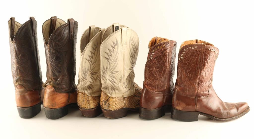 Includes (1) pair of signed snakeskin boots with white leather, signature reads "Randy Travis", good condition, (1) pair of light and dark brown leather boots with stitch work in good condition, and (1) pair of brown leather boots with stitch work in okay condition.