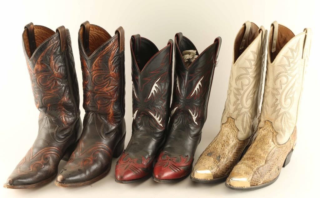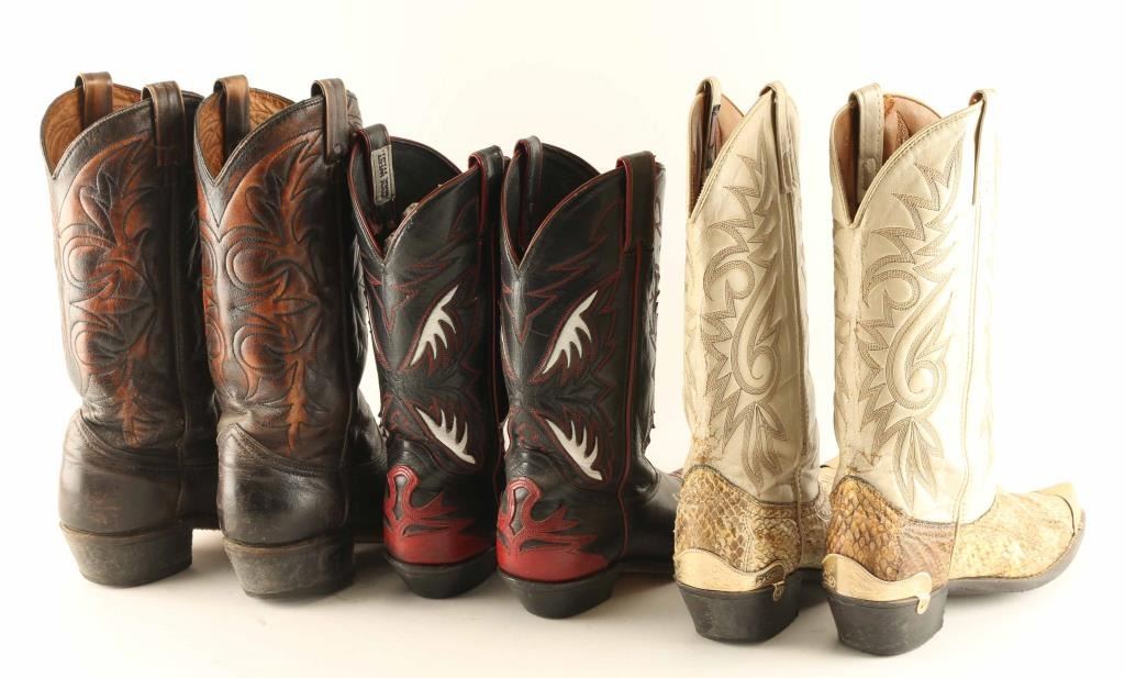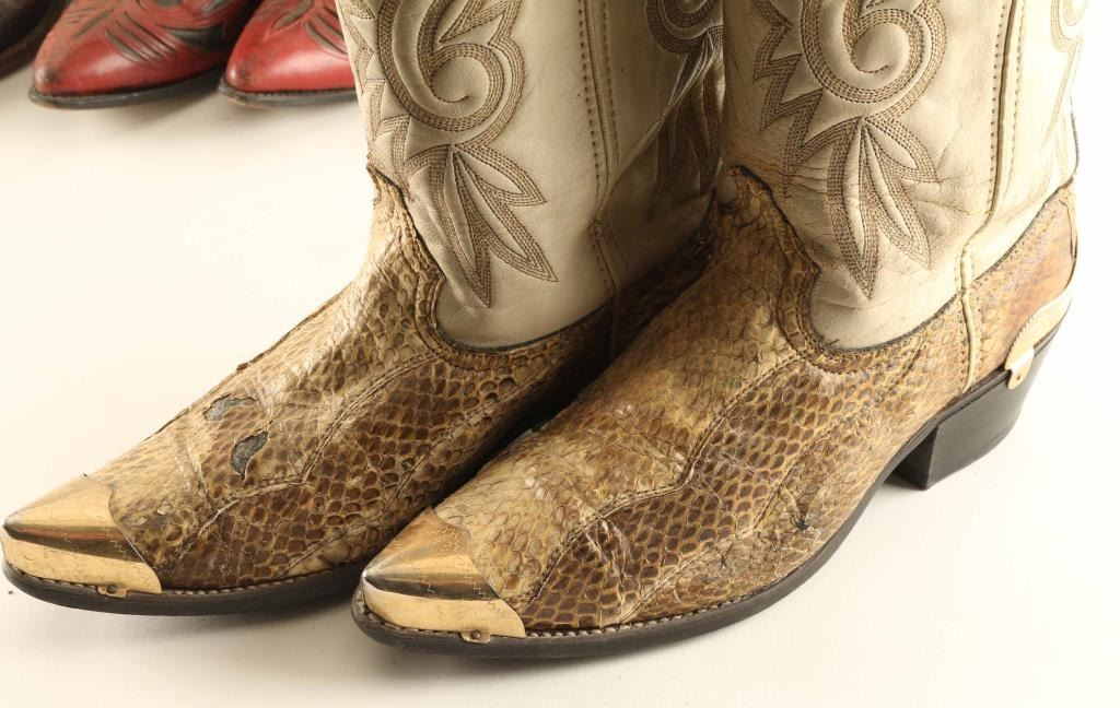 Lot includes (1) pair of snake skin boots with white leather stitch work designs in good condition, (1) pair of dark brown leather with light brown accents around the stitching in very good condition, and (1) pair of black leather boots with red and white leather accents with red and black stitch work, good condition.