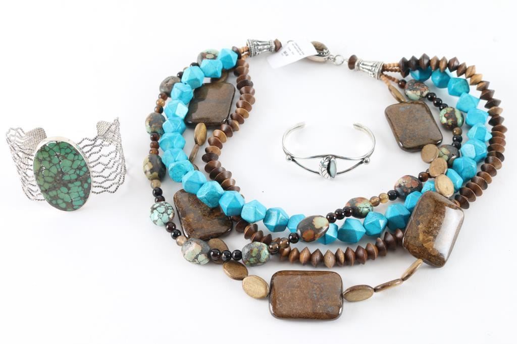 Sterling silver and turquoise (approx 2"x1-1/2") cuff bracelet, a dainty sterling silver with mother of pearl inside a feather motif and a an unworn, brand new with tag 4-strand turquoise, brown and Leopard Jaspet and 22" long.