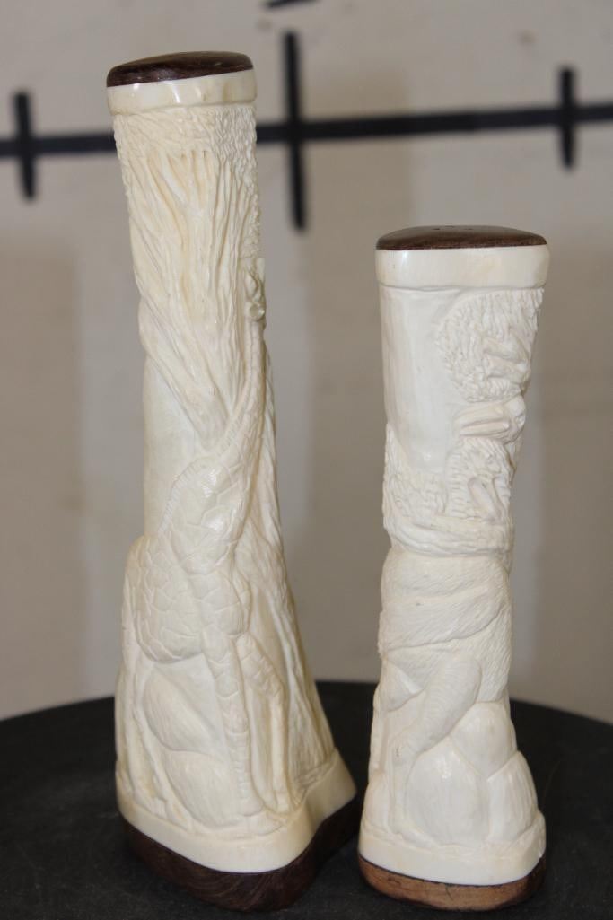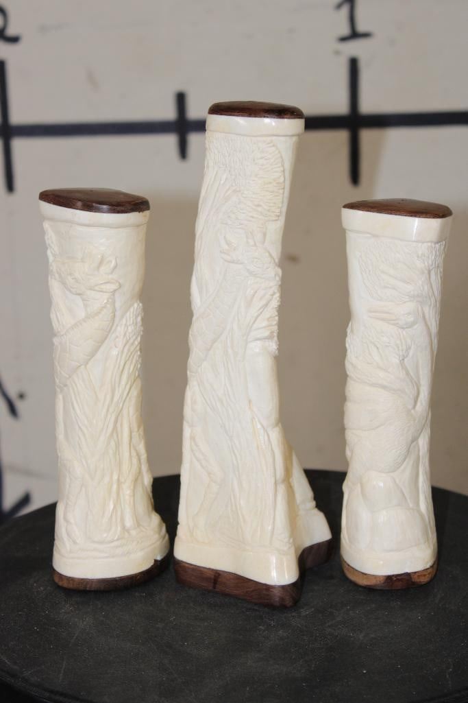 Very Nice Set of 3 Scrimshawed GIRAFFE BONE Salt or Pepper Shakers. The Top and Bottom of the Shakers is made from carved leadwood. (ONE$) TAXIDERMY KITCHENWARE