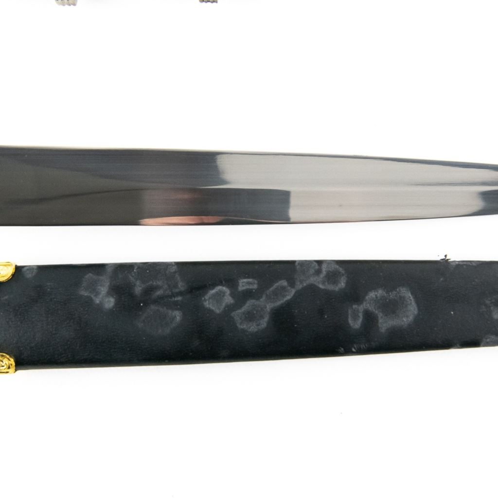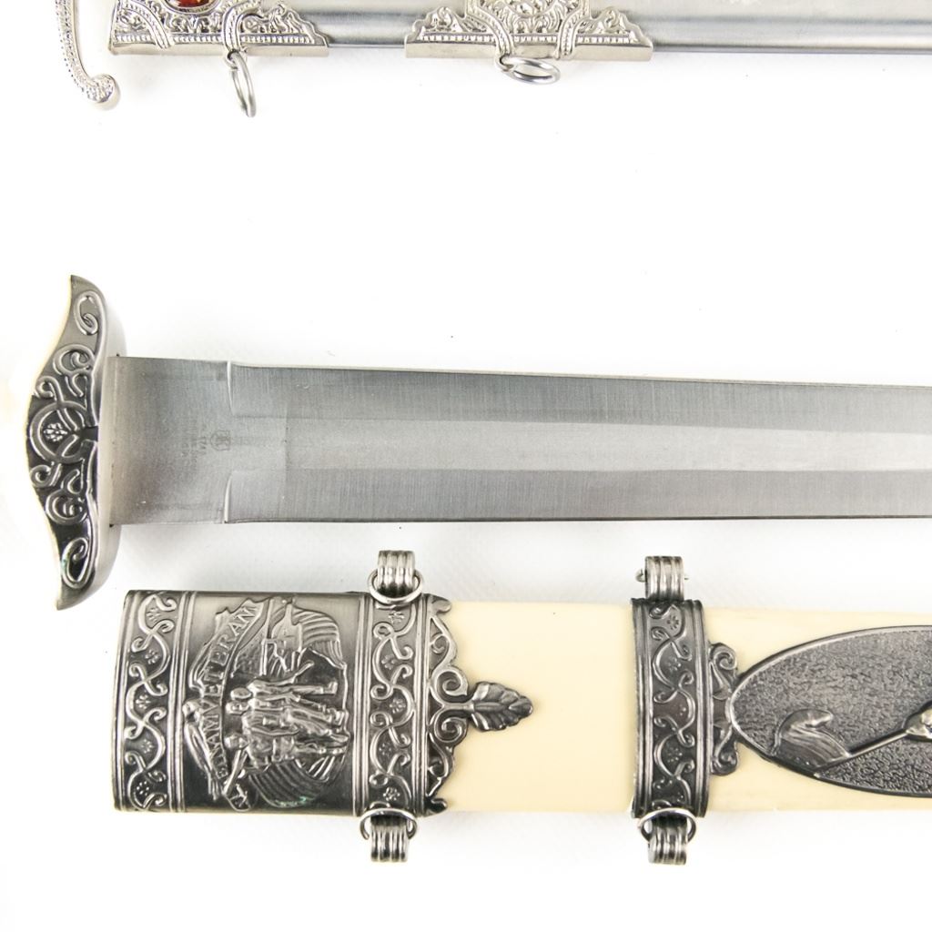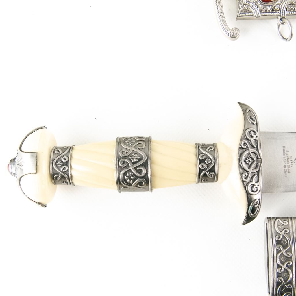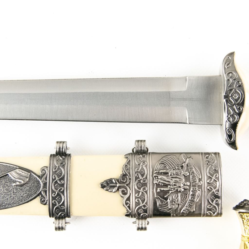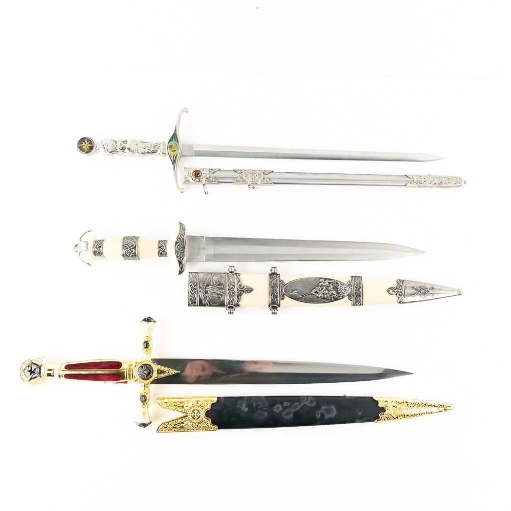 3 Imported short sword or dagger style knives. All Three appear to be brand new condition, 3 very different decoration and blade styles. Lengths range from 20-21" overall. All come with correct scabbards. See Photos