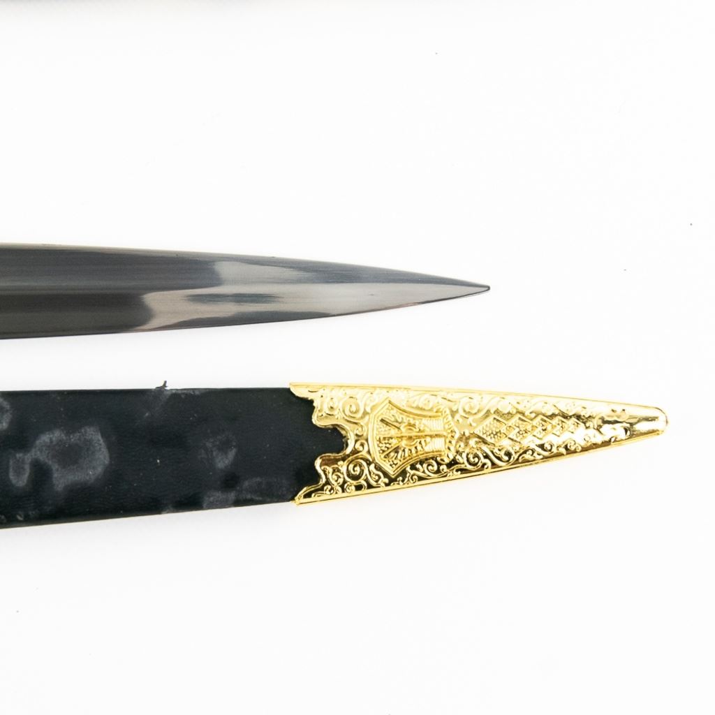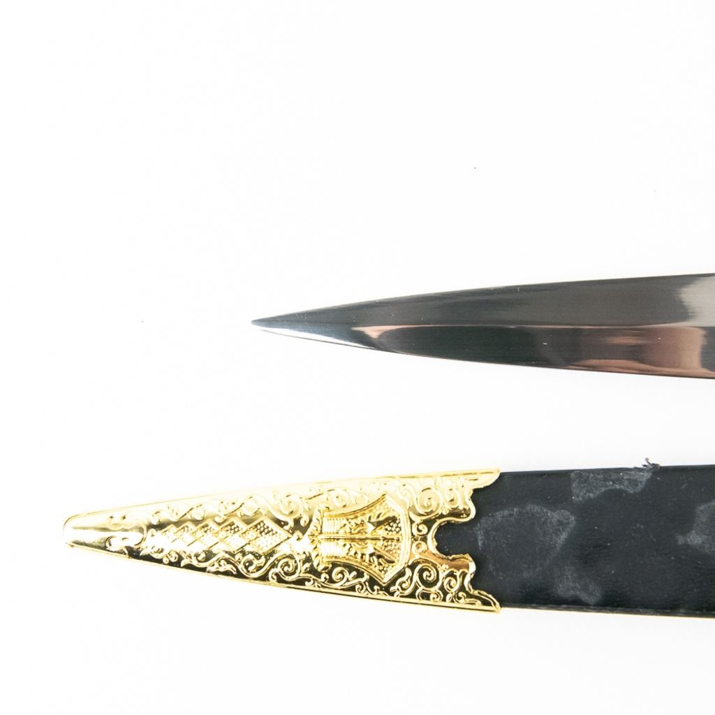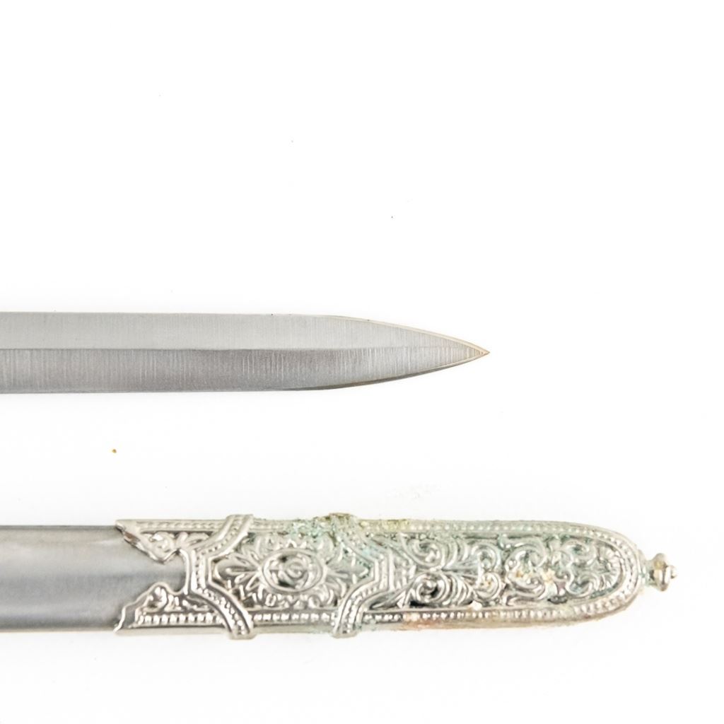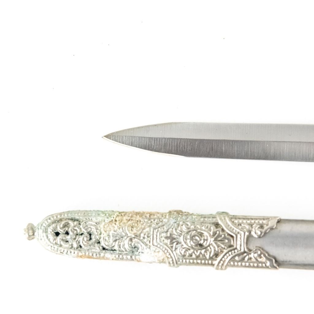 3 Imported short sword or dagger style knives. All Three appear to be brand new condition, 3 very different decoration and blade styles. Lengths range from 20-21" overall. All come with correct scabbards. See Photos