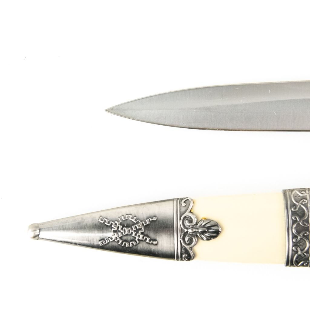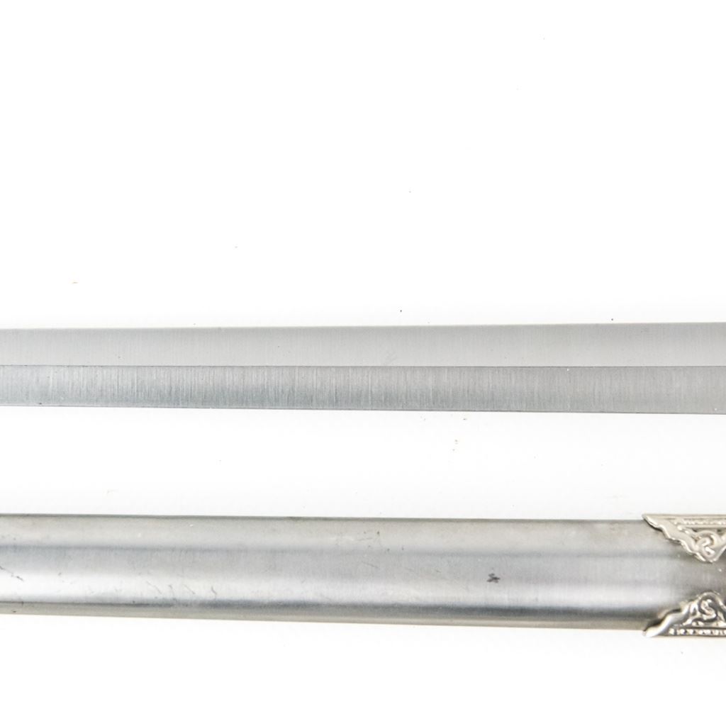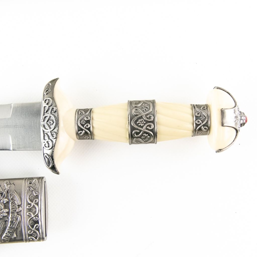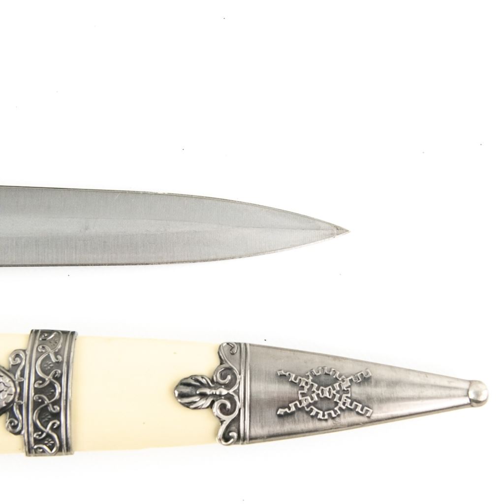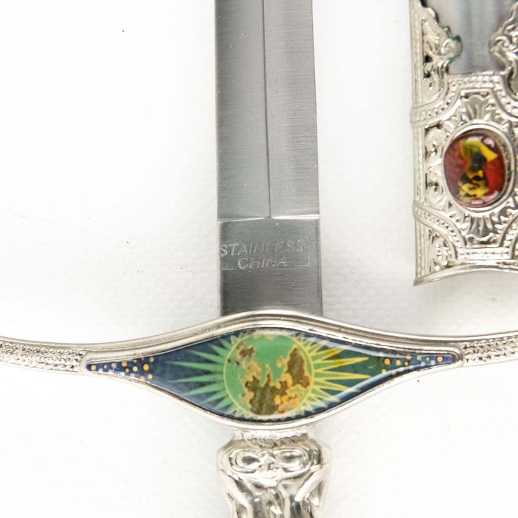 3 Imported short sword or dagger style knives. All Three appear to be brand new condition, 3 very different decoration and blade styles. Lengths range from 20-21" overall. All come with correct scabbards. See Photos