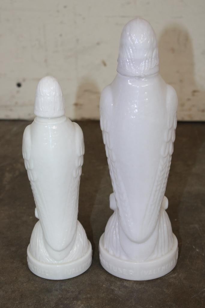 4 Vintage Liquor Decanters or Bottles. 2 Vintage Destilerias El Lorito Valencia Parrot Milk Glass Figural Liquor Bottles. The larger bottle measures 10" Tall with a 3" Diameter and a smaller bottle measures 8" Tall x 2.5" Diameter. One 1.75L Crown Royal liquor bottle wrapped in DIAMONDBACK RATTLESNAKE Skin. 1 Bell's Scotch Whiskey from Perth-Scotland in the shape of a bell from the 1960's, it measures 9.75" Tall x 6" Diameter. (ONE$) COLLECTIBLE LIQUOR BOTTLES