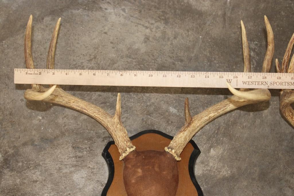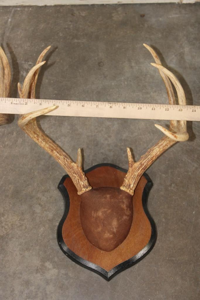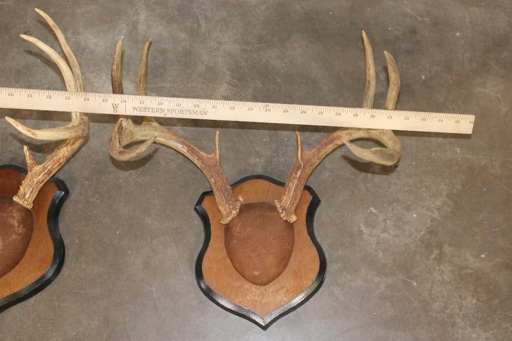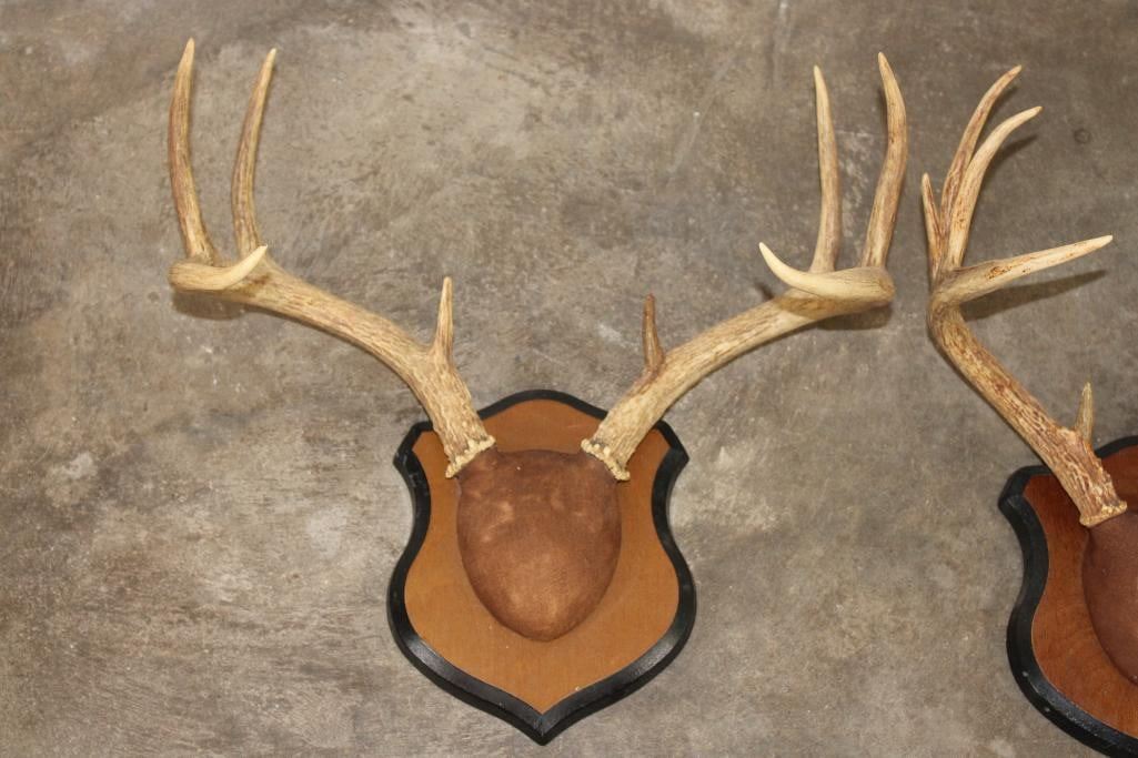 3 Respectable WHITETAIL DEER Racks mounted on matching Wooden Plaques. There is one 8-Point Rack and two 9-Point Racks. (ONE$) TAXIDERMY