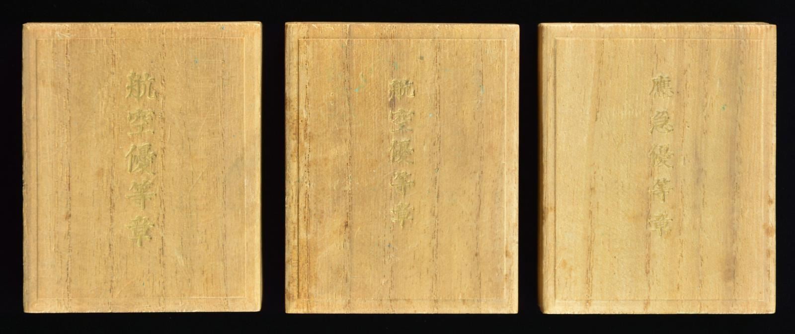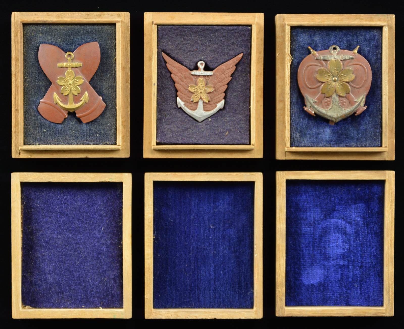 These 3 badges consist of a Navy Gunnery Proficiency 2nd Class Badge, a Navy Proficiency Badge given to ranks below Petty Officer, and a Damage Control Proficiency Badge. All badges are bronze colored with gold or silver plated details. Each badge has a wide pin on the reverse. The badges are housed in their original wooden presentation cases with gold impressed writing on the lids. CONDITION: badges show light wear, as do the presentation boxes. (02-19549/BF). $500-700.