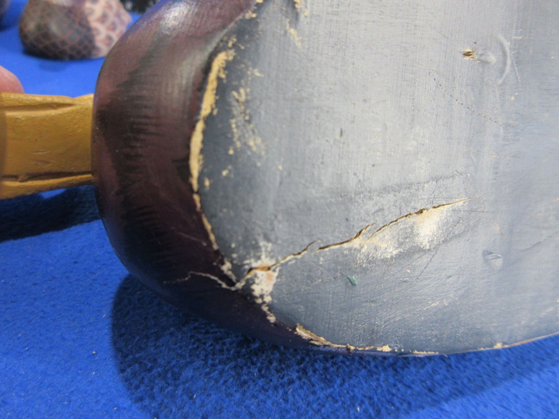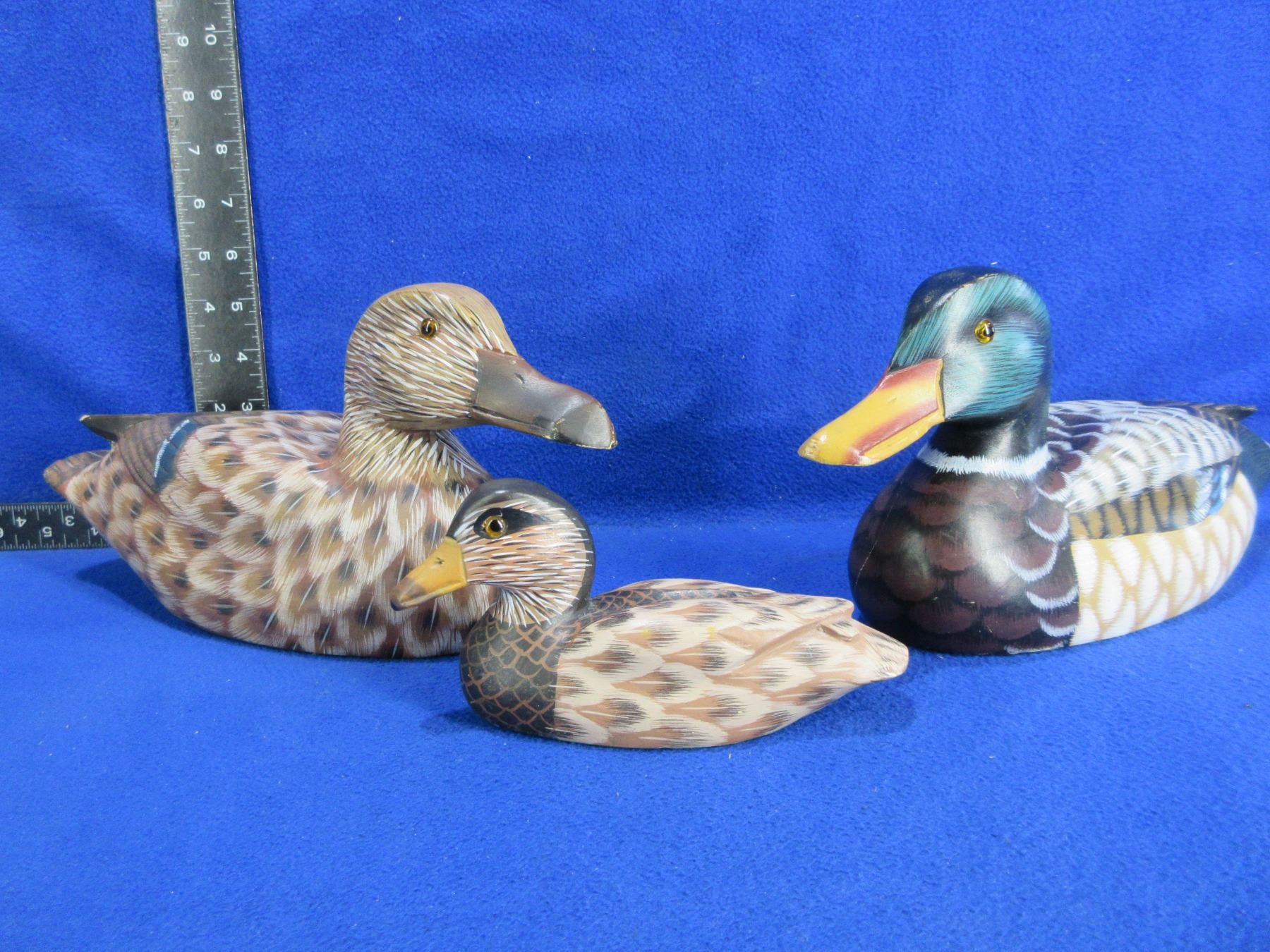3 Wood Mallard Ducks - Appear Hand Painted - Drake has a crack repair at the back, hen has a small chip/crack at the back and duckling has a tiny chip at the back.