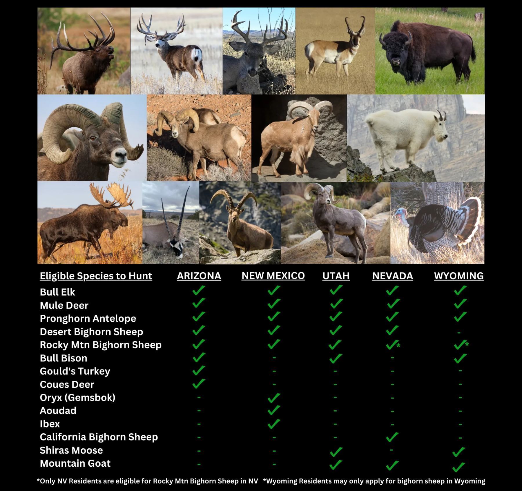 NOT INCLUDED: Annual state hunting licenses, application fees ($45 per species, per state), state big game tag fees (paid only when you draw).