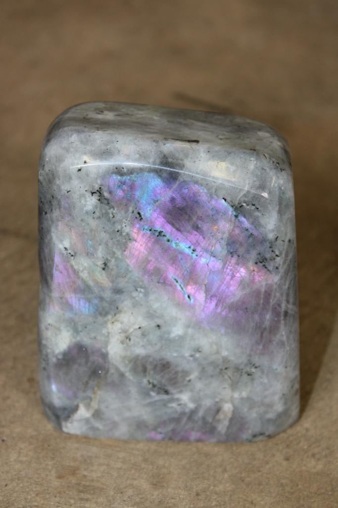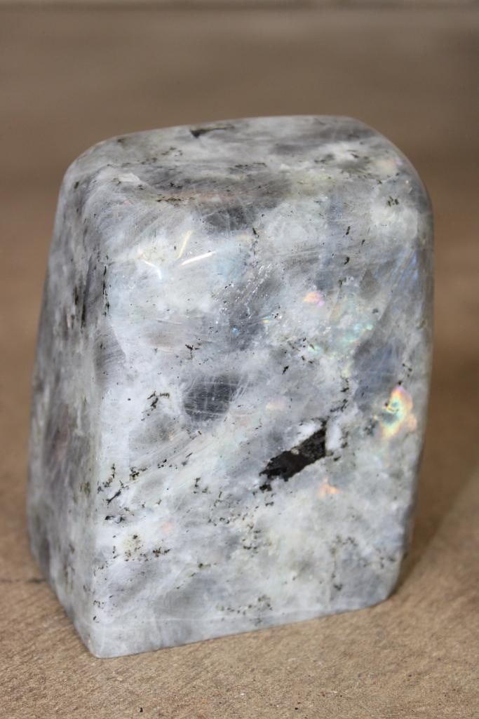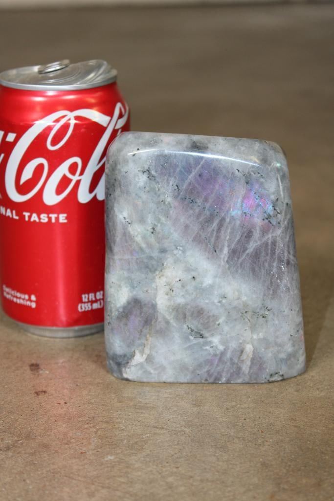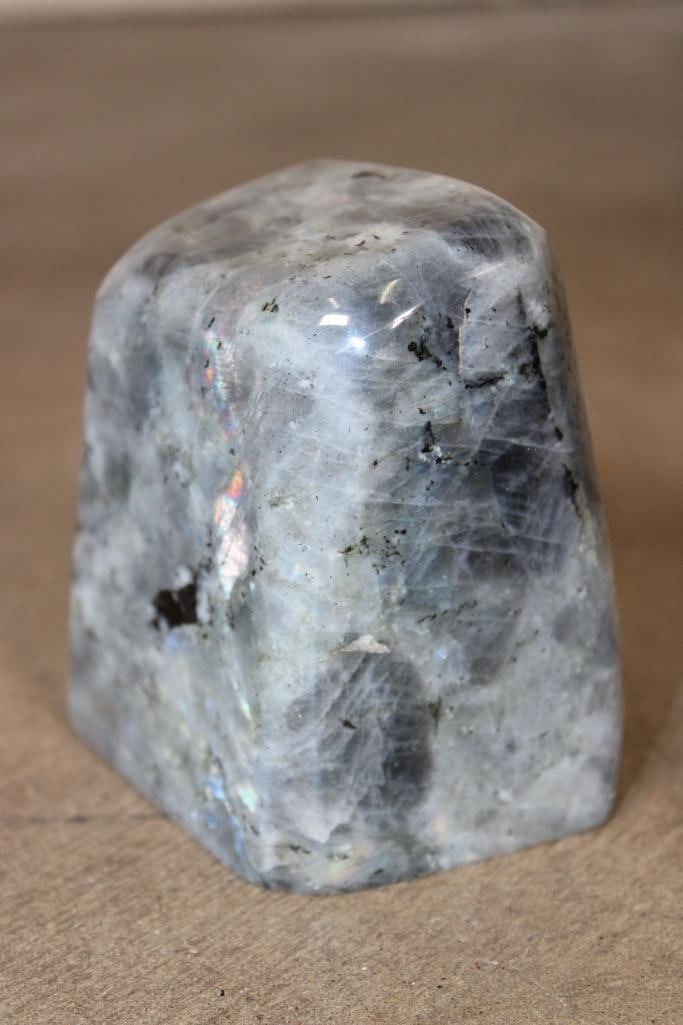 Lovely Formed and Polished LABRADORITE Specimen with a smooth cut base. It has a beautiful shimmering iridescent colorway. 3 lb Total Weight and it measures 4.25" Tall x 3.5" Long x 2.75" Wide. Labradorite displays a unique optical effect called Labradorescence, where light reflects off internal mineral layers, creating iridescent colors. ROCKS MINERALS FOSSILS