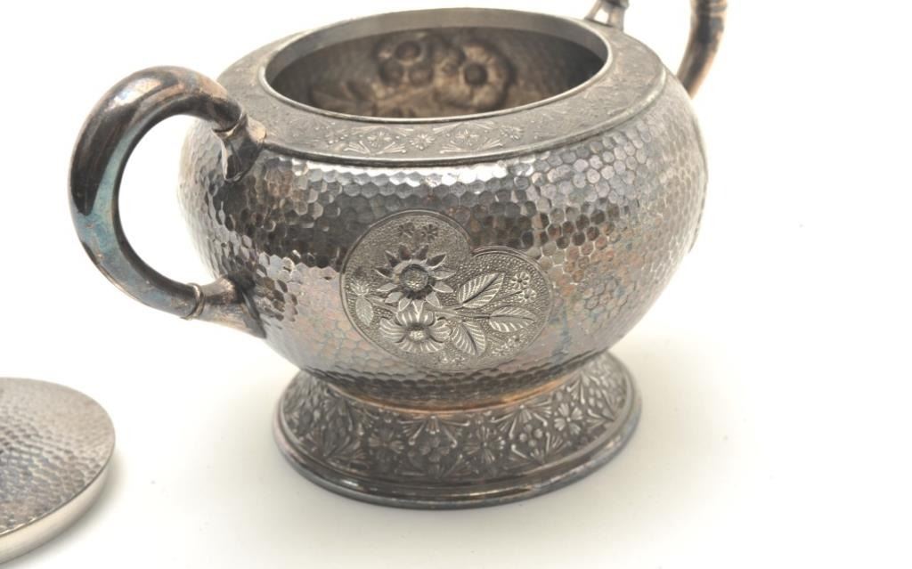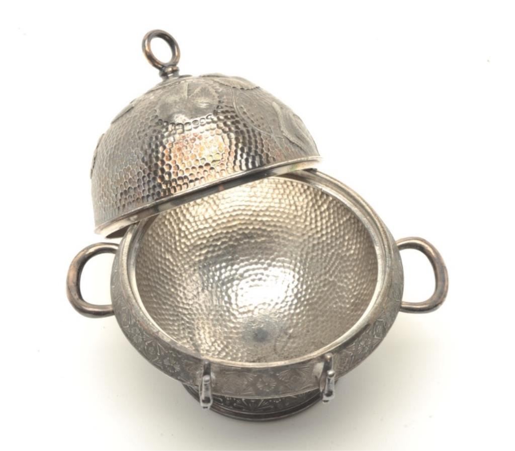 2 matching in Japanese designs with florals and bugs. 1 butter dish and 1 sugar bowl. Both marked 1934 (date?). In near fine condition with no butter knife. 1 covered jar with frosted glass insert. Fancy florals. Measures 5” in height. Very good plus. Est.: $100-$200